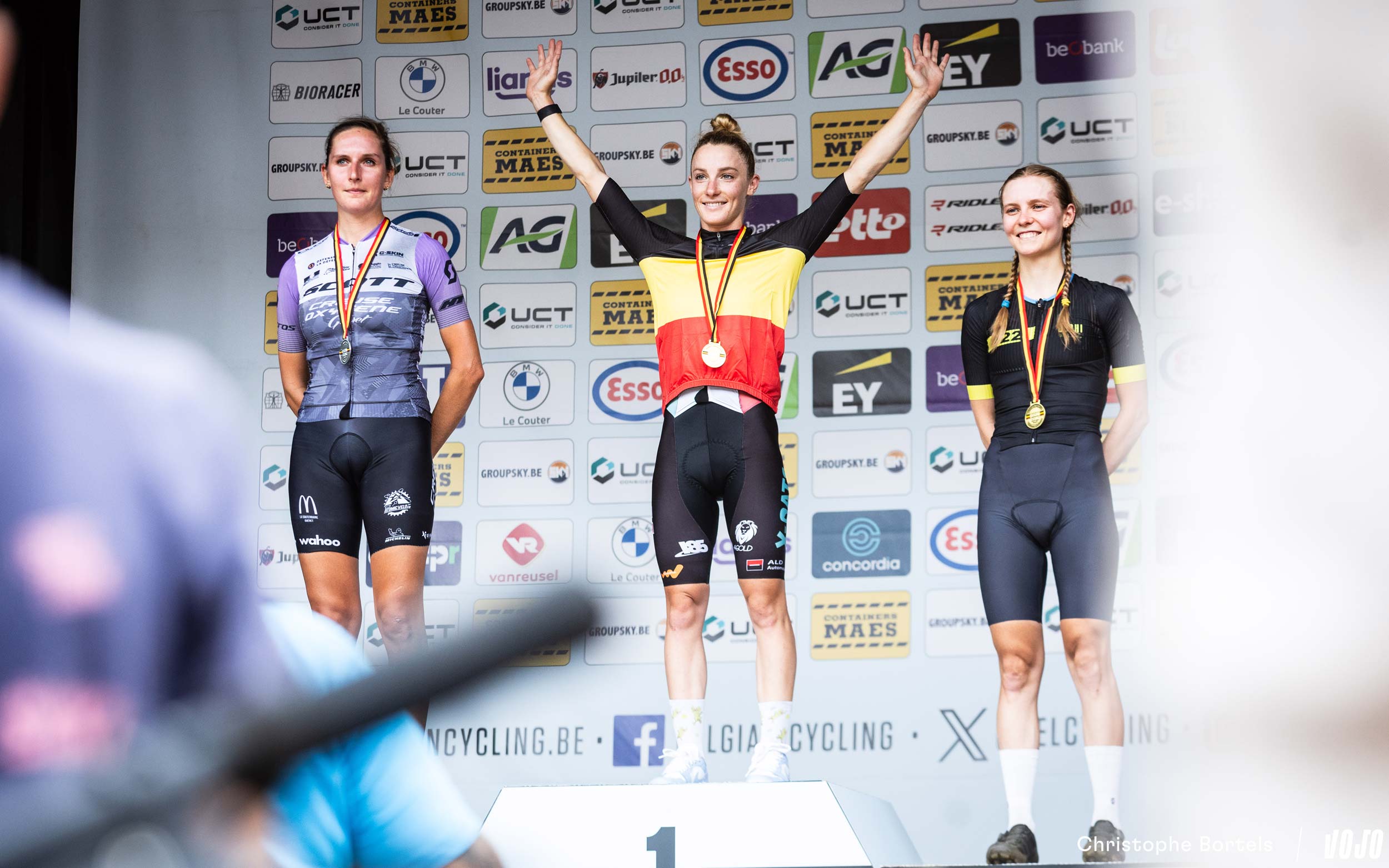Le podium Elite : Emeline Detilleux (2e), Alicia Franck (1ère) et Britt Segers (3e).