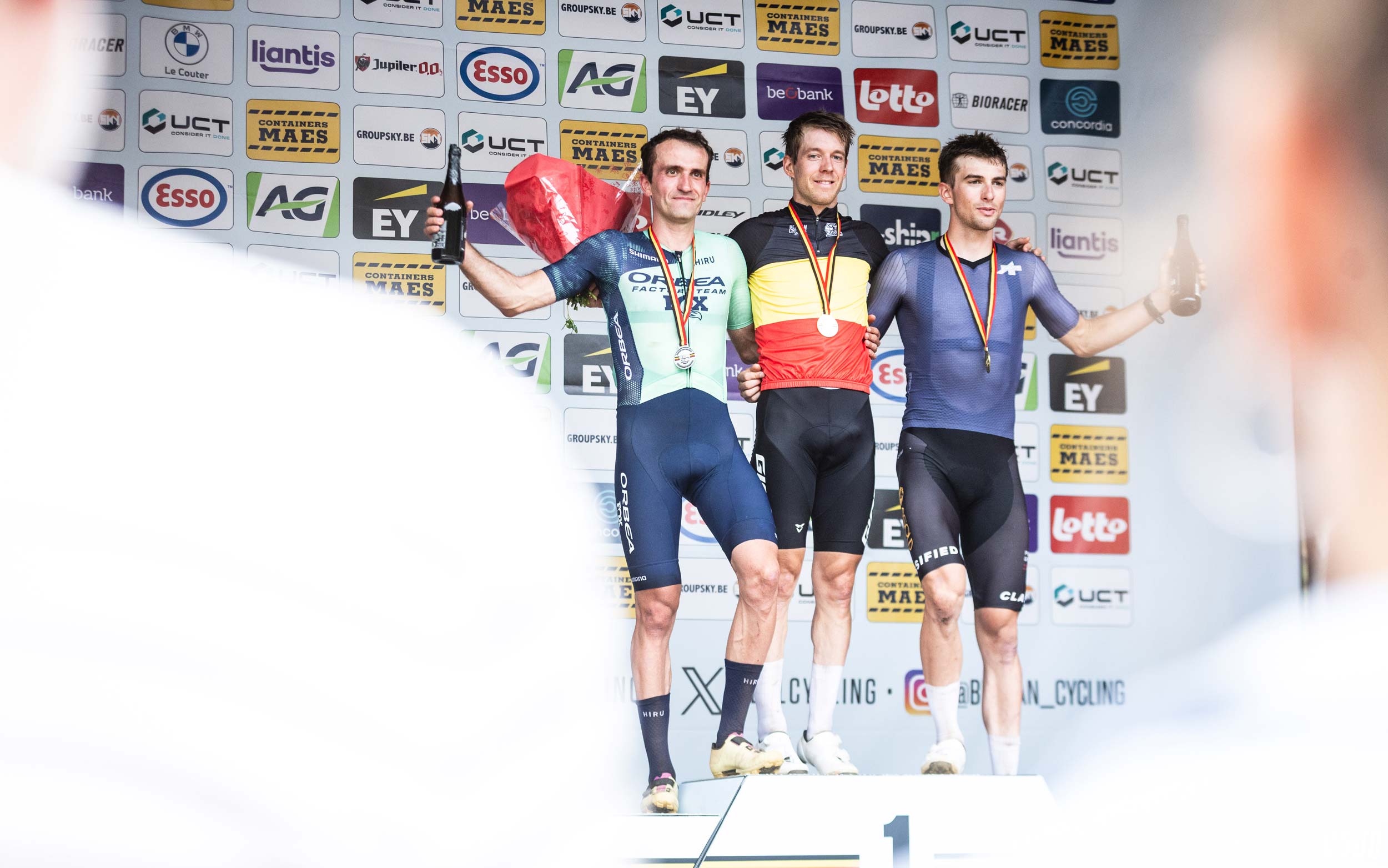 Le podium Elite : Pierre de Froidmont (2e), Jens Schuermans (1er) et Jarne Vandersteen (3e).