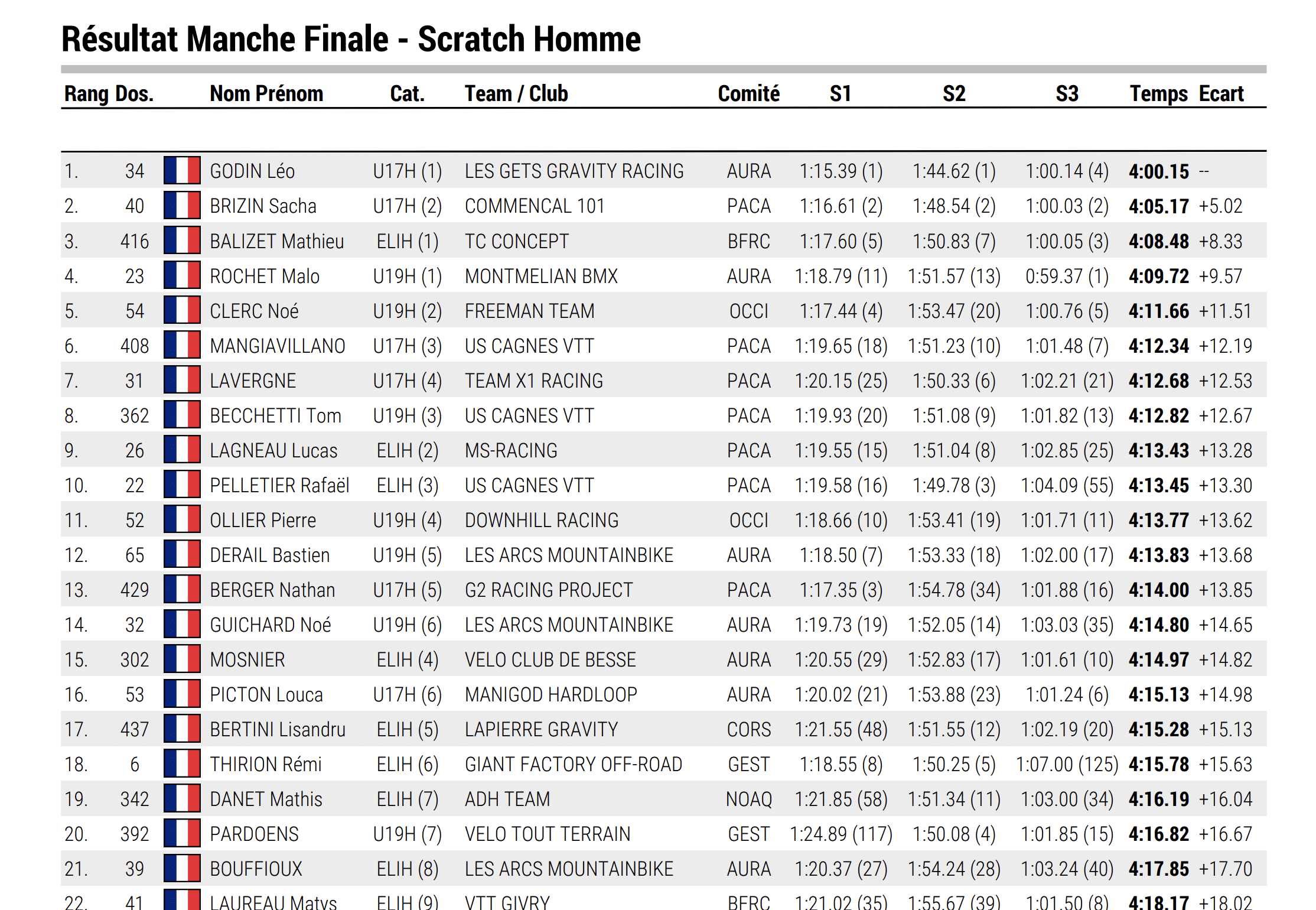 La pluie est venue bousculer la finale des championnats de France de DH aux 2 Alpes. Sur la start-list, les riders les moins rapides des qualifications s’élancent en premier, avant de laisser la place aux meilleures femmes, puis aux meilleurs hommes. Avant le passage des femmes, une pluie orageuse s’abat sur la station, transformant la piste, le grip et rebattant les cartes. Le jeune cadet Léo Godin est à ce moment-là sur le hot seat et n’en descendra pas. Les meilleurs hommes chutent ou ne réussissent pas à rattraper son chrono réalisé sur le sec. Chez les femmes, les quatre dernières participantes partent sous la pluie, et Lisa Bouladou s’en sort le mieux, conservant au passage son maillot de championne de France.