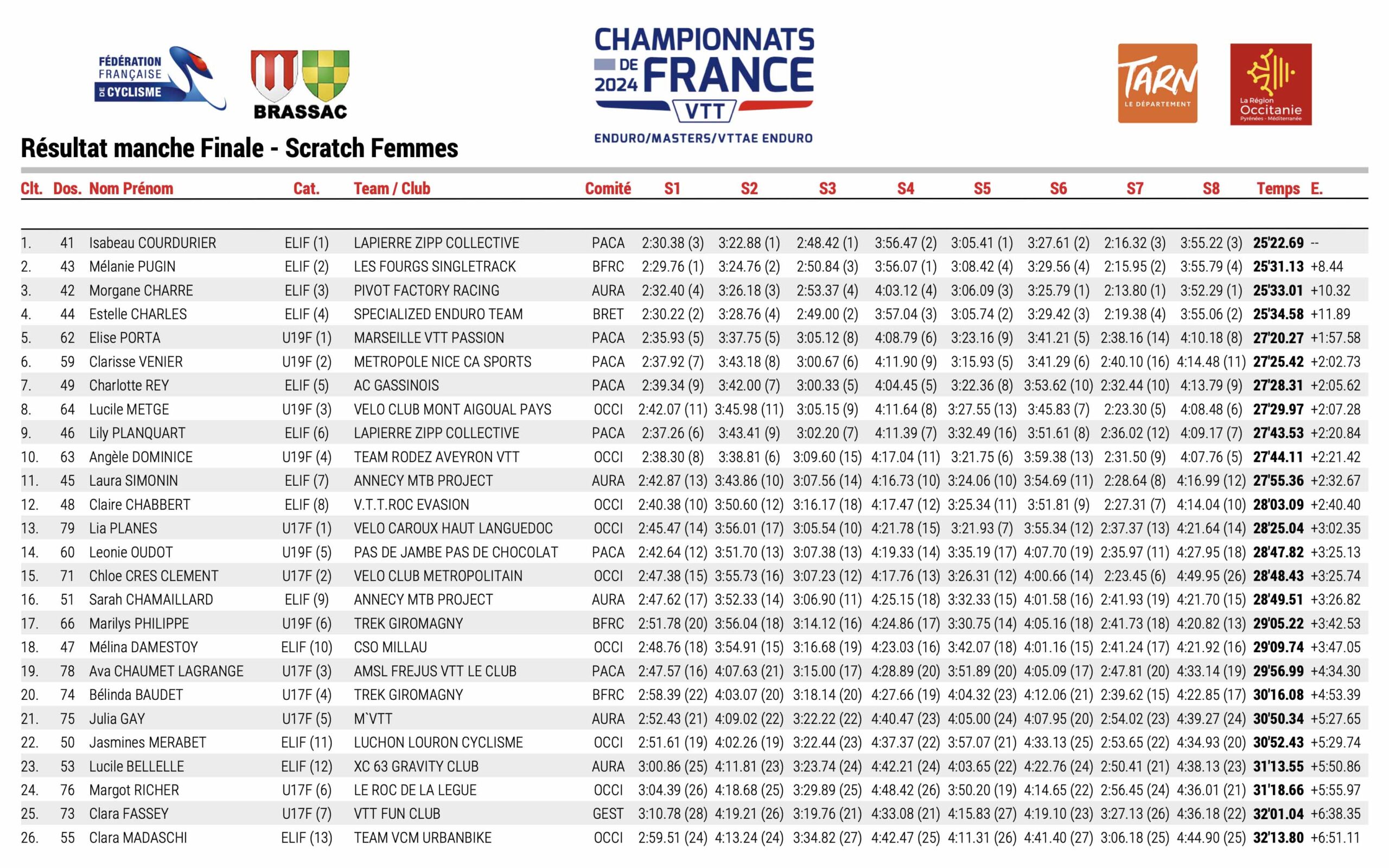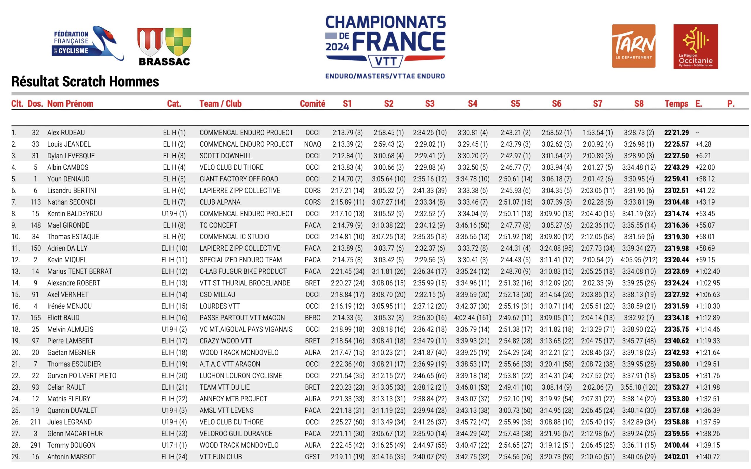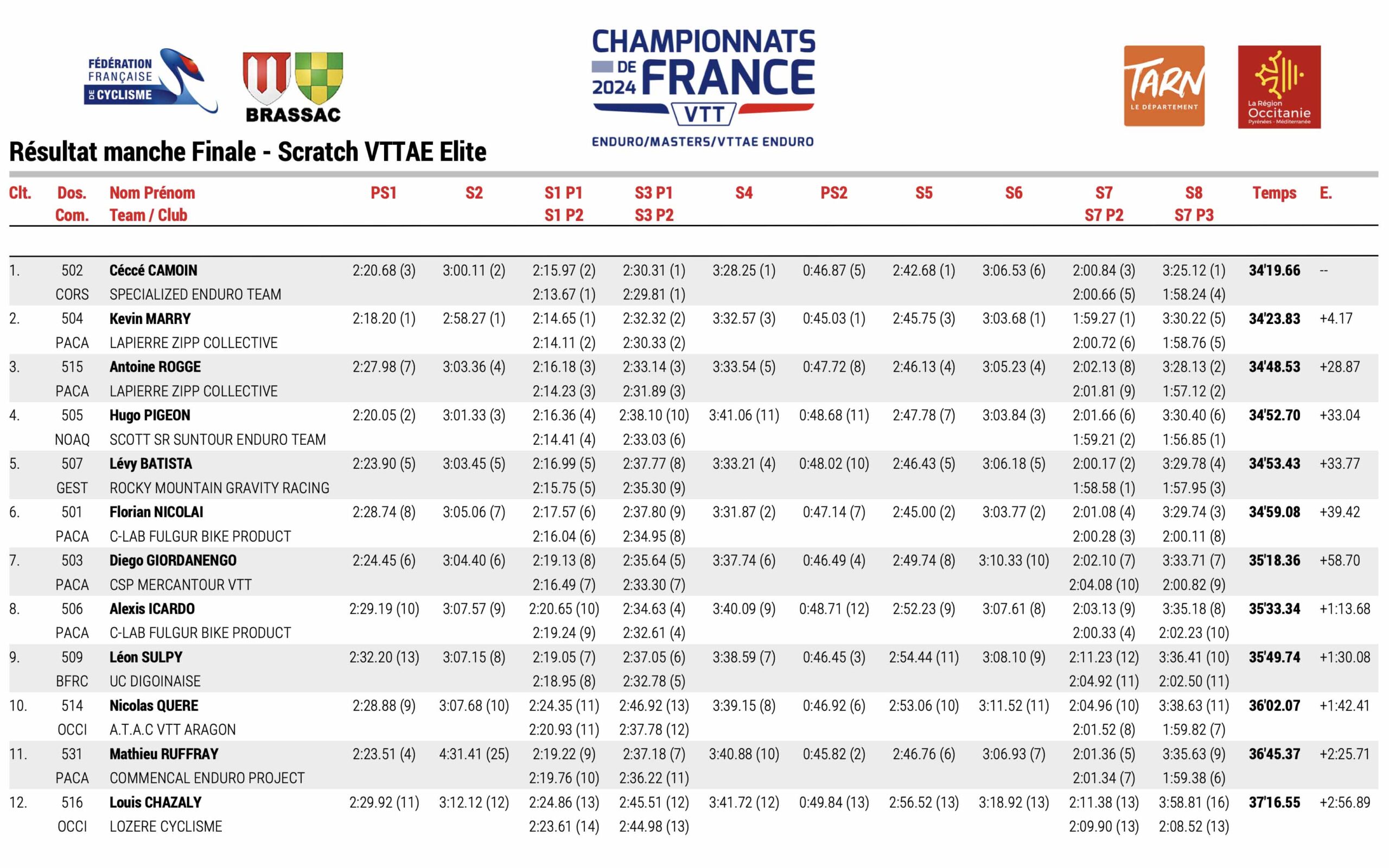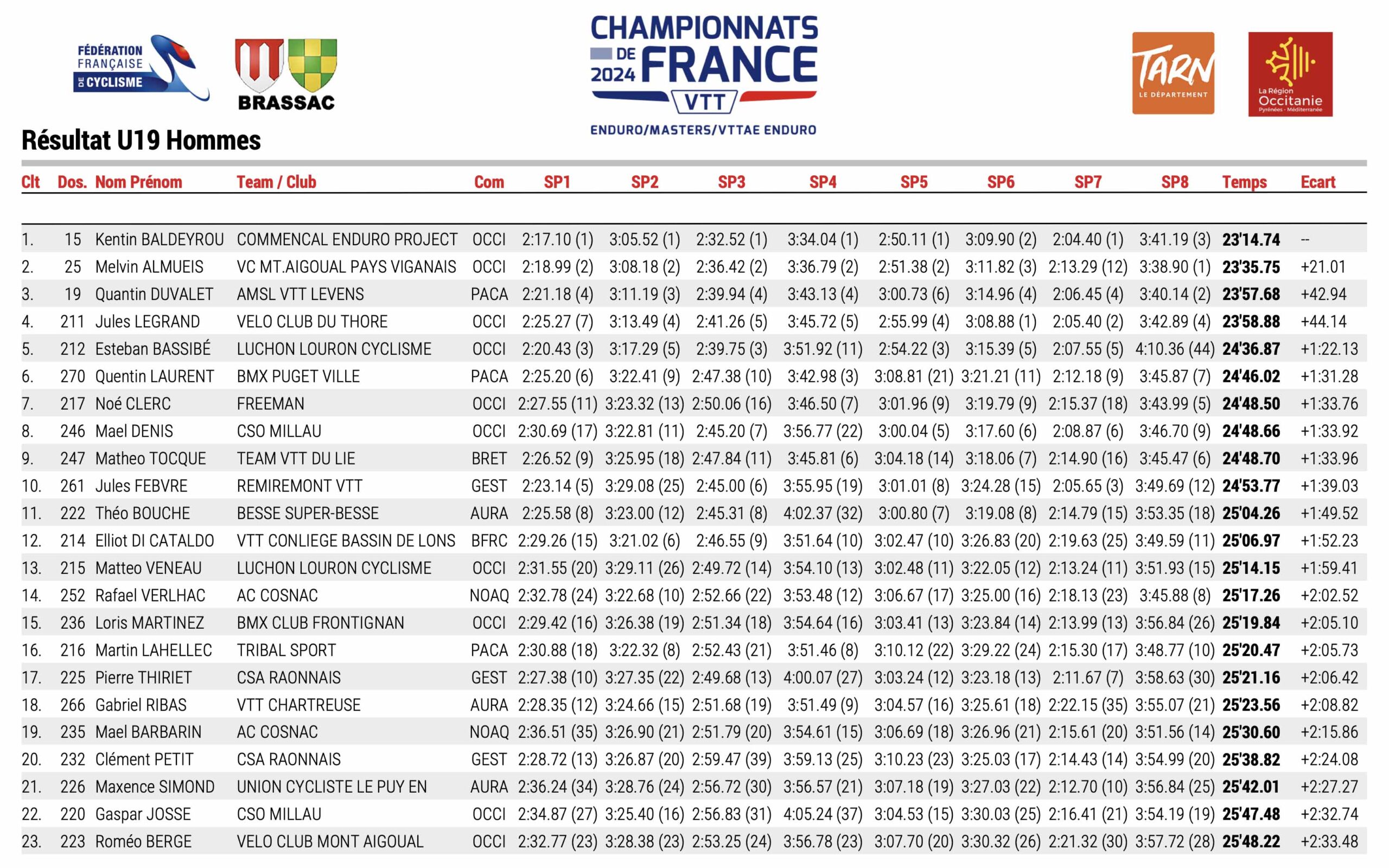 Le top 5 est complété par Albin Cambos et Youn Deniaud. On notera également la bonne performance de Kentin Baldeyrou, encore classé au sein de la catégorie U19, et qui termine 8e au classement général juste devant Mael Gironde (9e), le descendeur Thomas Estaque (10e), Adrien Dailly (11e) et Kevin Miquel (12e).