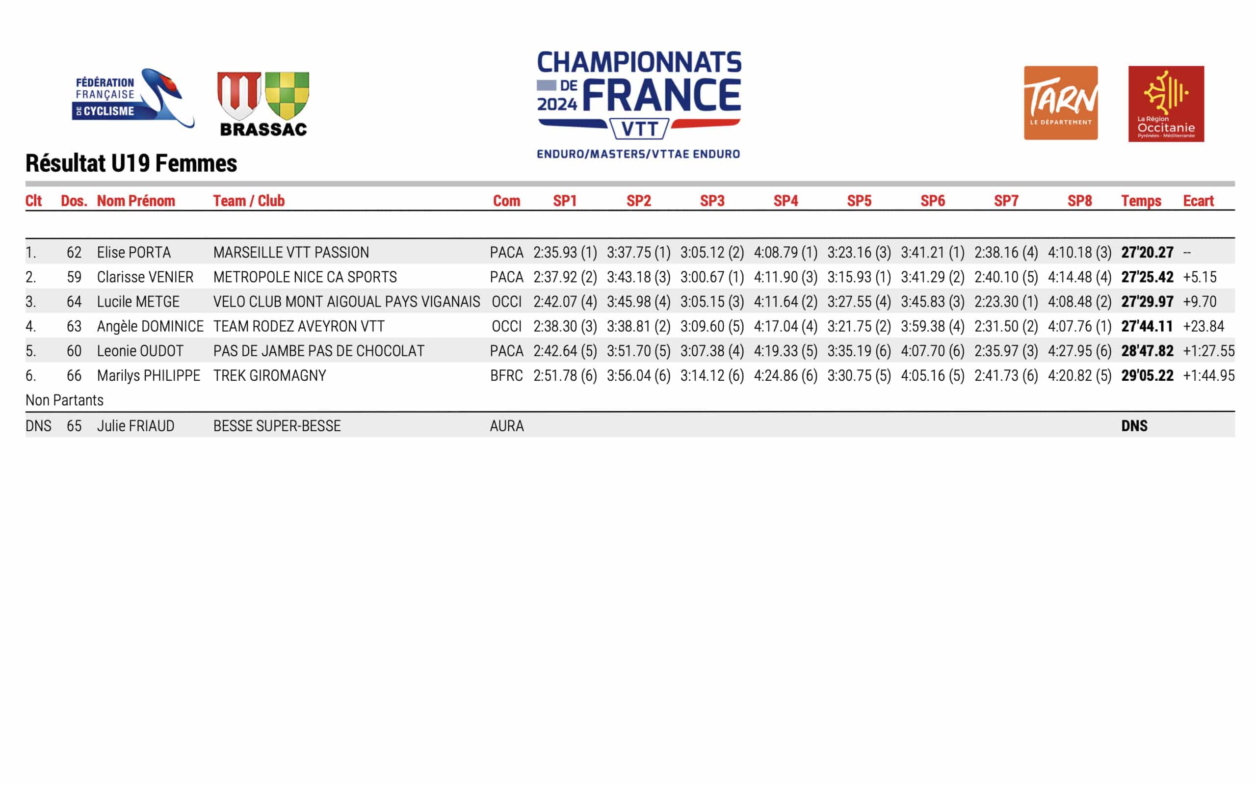 Pour la quatrième place, on retrouve Estelle Charles puis deux autres membres du comité PACA et encore U19 : Élise Porta et Clarisse Venier.