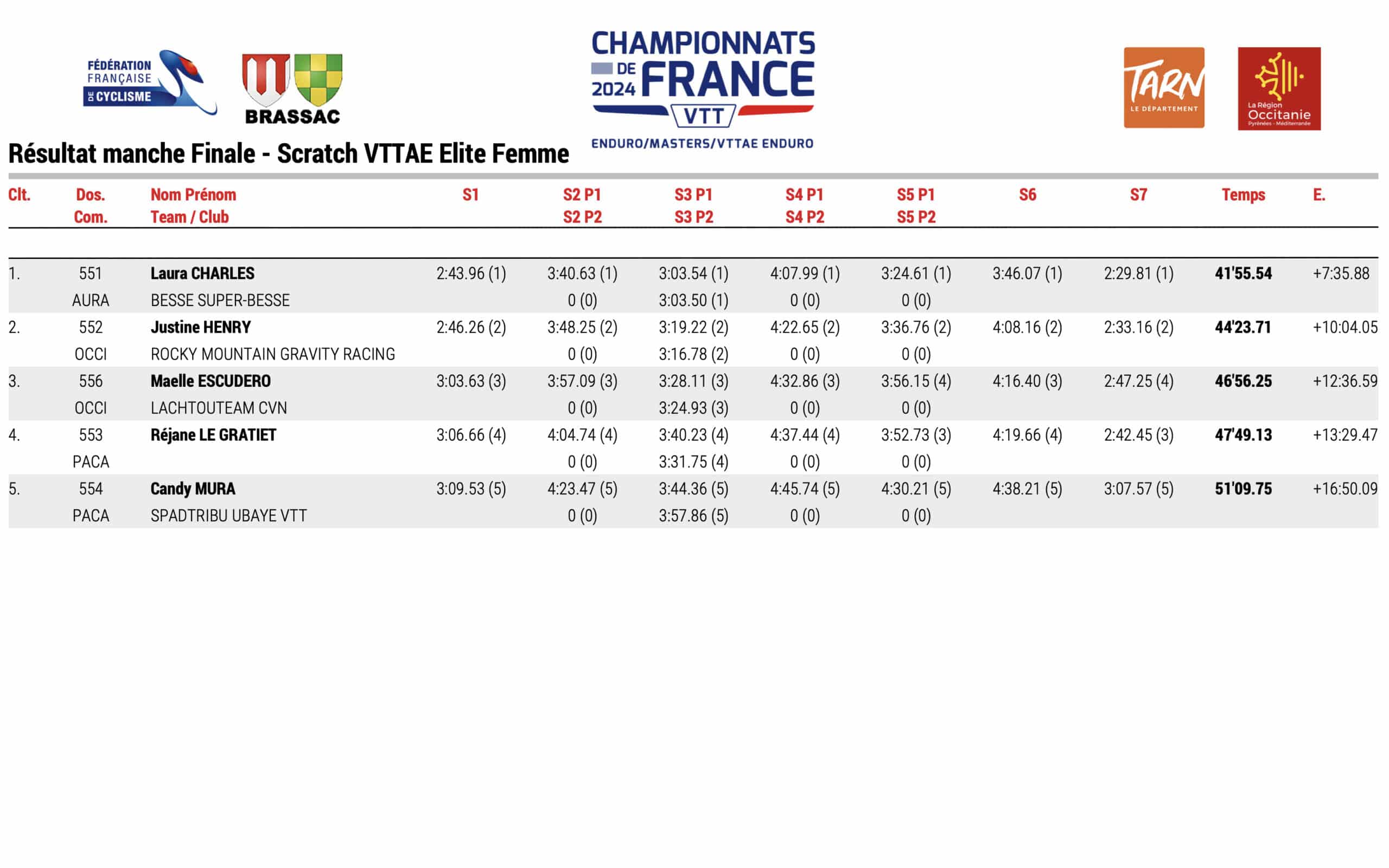 Chez les dames, Laura Charles remet le couvert et s’offre le maillot bleu-blanc-rouge pour une seconde année consécutive. Elle devance d’un peu moins de trois minutes Justine Henry, tandis que Maelle Escudero finit sur la troisième marche du podium.