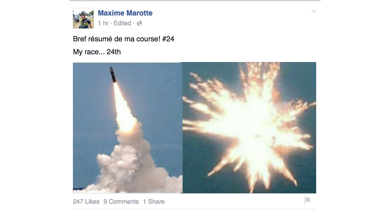 … Voici en effet comment Maxime Marotte a résumé sa course avec beaucoup d’humour sur sa page Facebook.