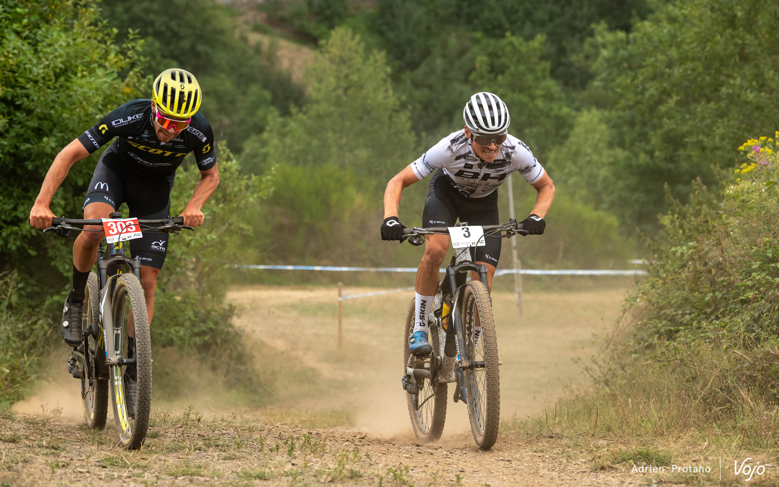 Julia Grégoire (BH Wallonie MTB team) et Emeline Detilleux prennent le meilleur départ et s’envolent en tête de la course.
