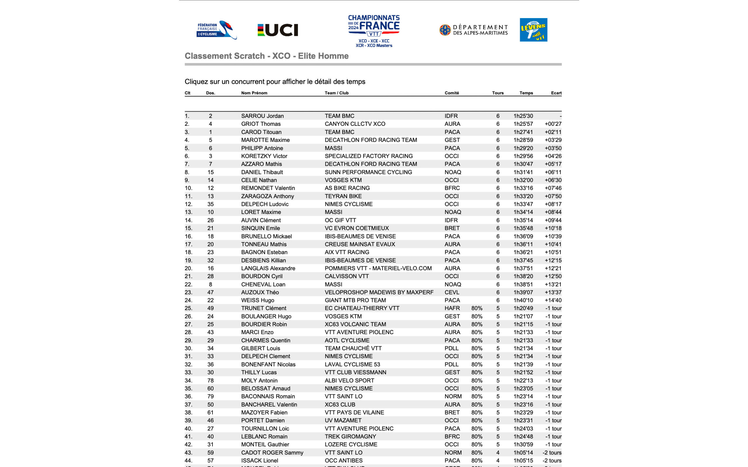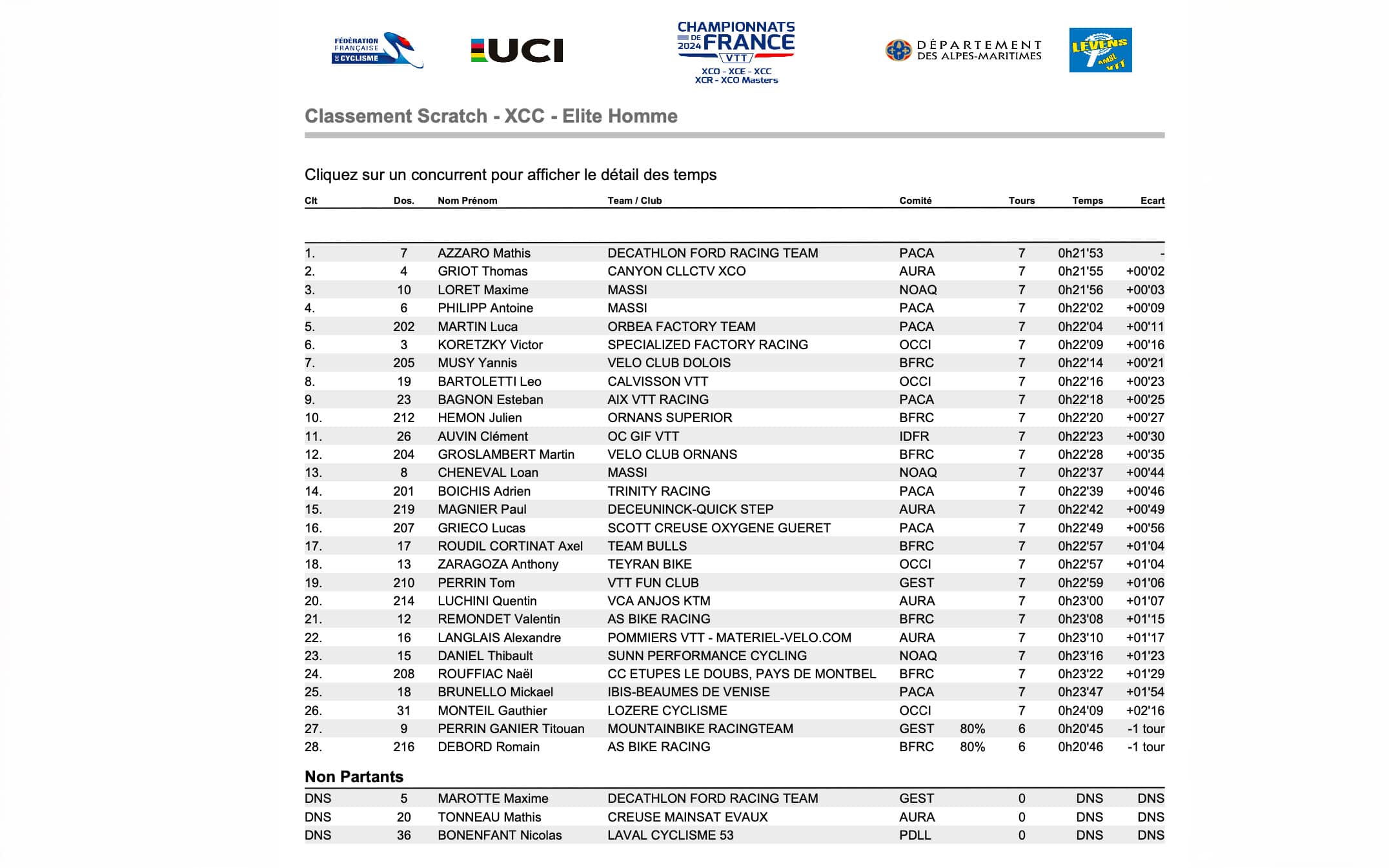 Résultats complets : Résultats XCO Levens Hommes Élites