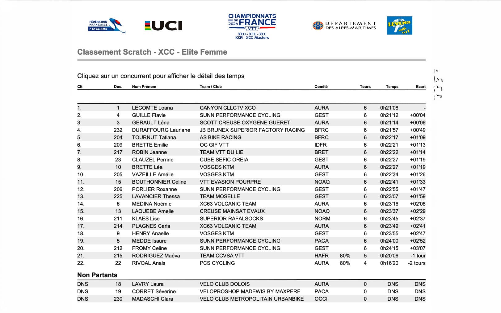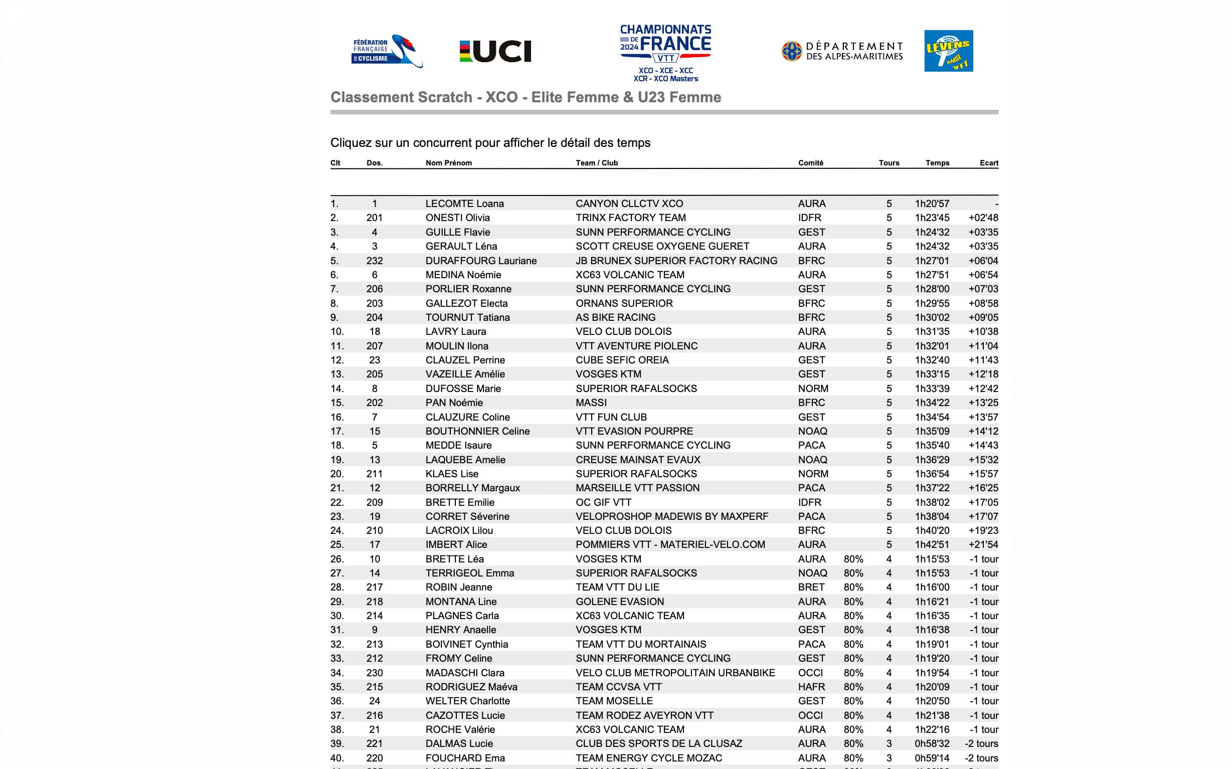 Résultats complets : Résultats XCO Levens Femmes Élites 2024