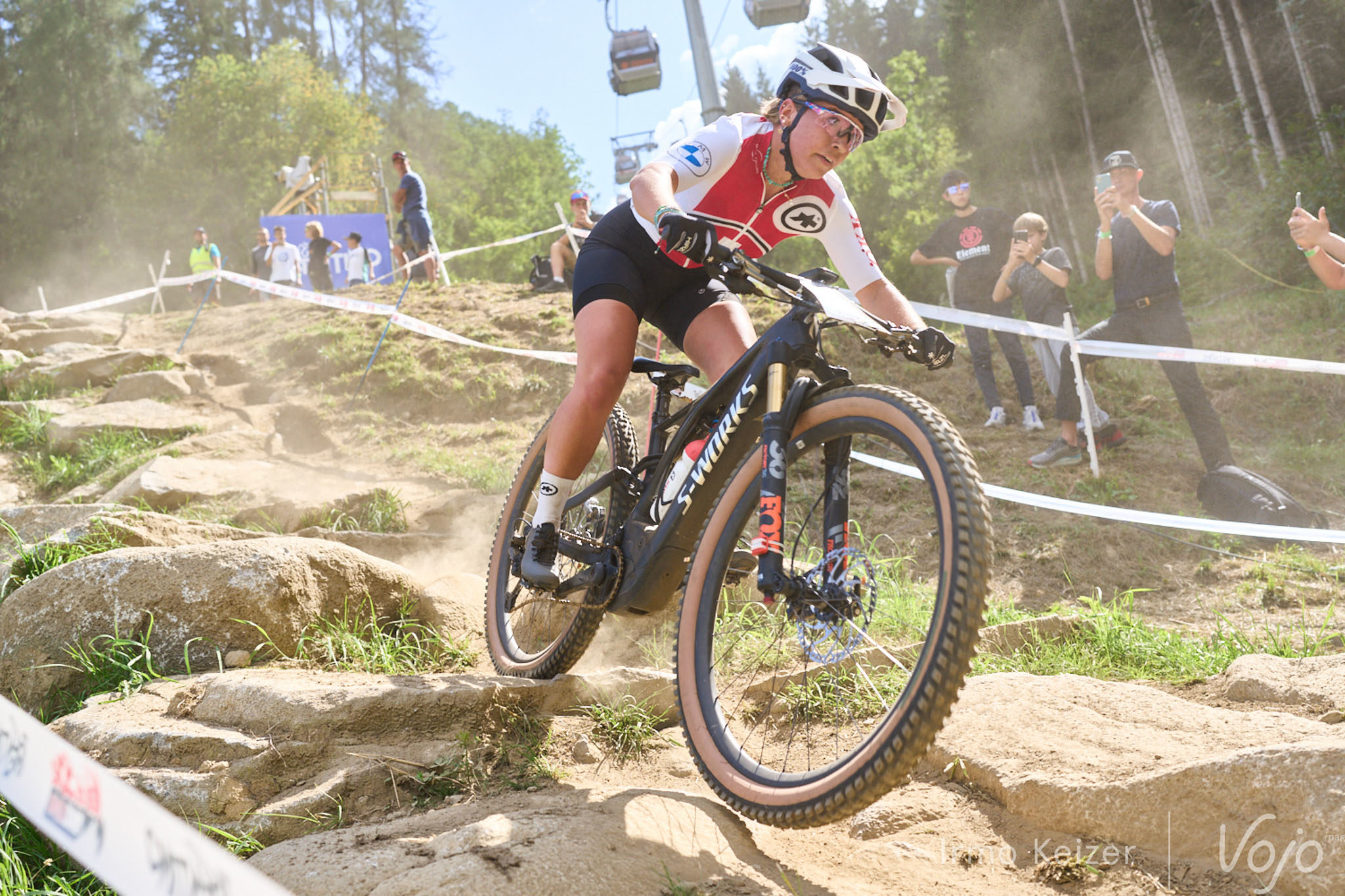 Les championnats du Monde UCI de VTTAE, qu’est-ce que c’est ? Quelques dizaines de pilotes (21 chez les femmes, 40 chez les hommes) qui tournent en VTTAE pendant 50 minutes sur un circuit de XCO raccourci et légèrement modifié.