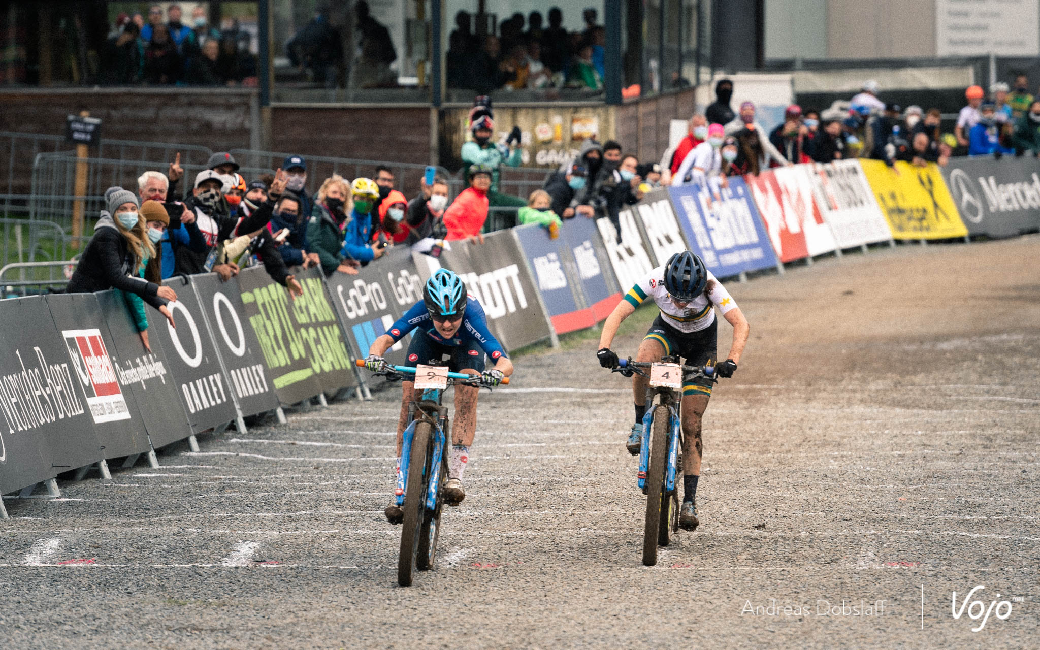 Une classe au-dessus de la concurrence, c’était sans doute la meilleure façon de décrire Pauline Ferrand-Prévot aujourd’hui. La Française a défendu son maillot de championne du Monde de la plus belle des manières, en s’isolant en tête dès la start-loop et en creusant l’écart tout au long de la course pour remporter, au terme des cinq tours, son troisième titre mondial en catégorie Elite, le cinquième en XCO et le douzième toutes disciplines et catégories confondues. Derrière en revanche, la bataille pour le podium fut bien plus disputée.