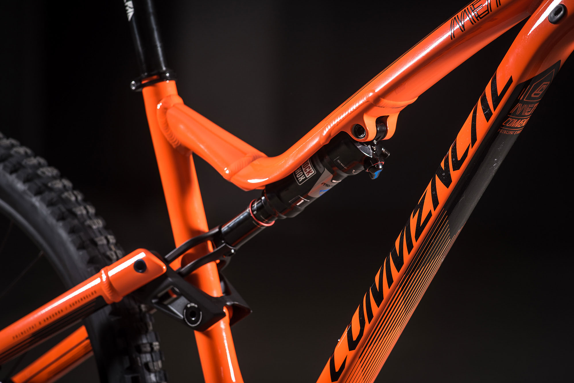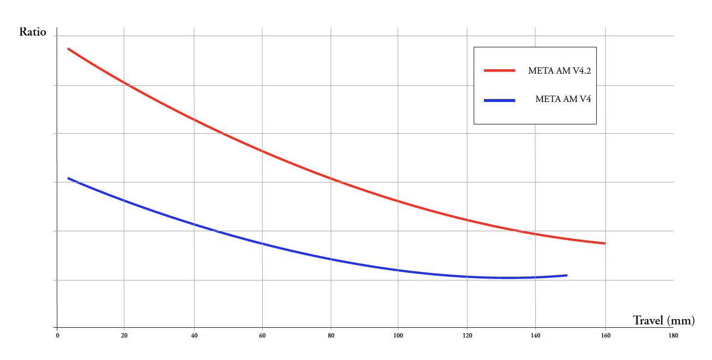 L’amortisseur monté d’origine est un RockShox Deluxe ou Super Deluxe (selon les versions) en format Métric 230x60mm dont le volume d’huile et pour la clapetterie est plus important que sur la génération précédente. Ce meilleur fonctionnement de l’amortisseur a permis à Commencal de revoir la cinématique « Contact System » du Meta AM V4.2 pour obtenir non seulement plus de débattement, mais aussi plus de sensibilité en début de course tout en laissant ensuite une part plus importante à l’hydraulique et au setting spécifique de l’amortisseur dans la gestion de la suspension arrière.