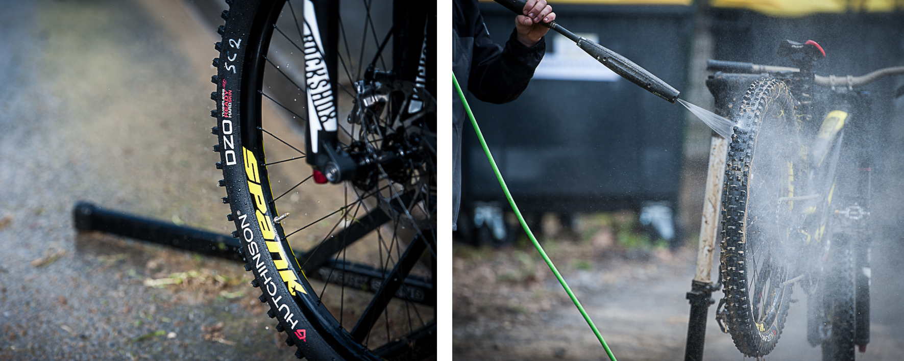 Du côté du train roulant, l’équipe Commencal Vallnord de Rémi a signé un nouveau partenariat avec Spank qui équipe les vélos du team en roues. Le modèle de descente, qui est encore en développement, a été retravaillé en interne. Les flancs sont nervurés pour assurer une meilleure accroche du pneu. Spank et Hutchinson ont effectué un travail commun pour répondre à cette demande. Le fabriquant de pneus équipe d’ailleurs le vélo de prototypes de ses DZO en section 2.5. Ils offrent une toute nouvelle gomme. Rémi gonfle ses pneus à 1,8 bars à l’avant et à 1,9 bars à l’arrière.