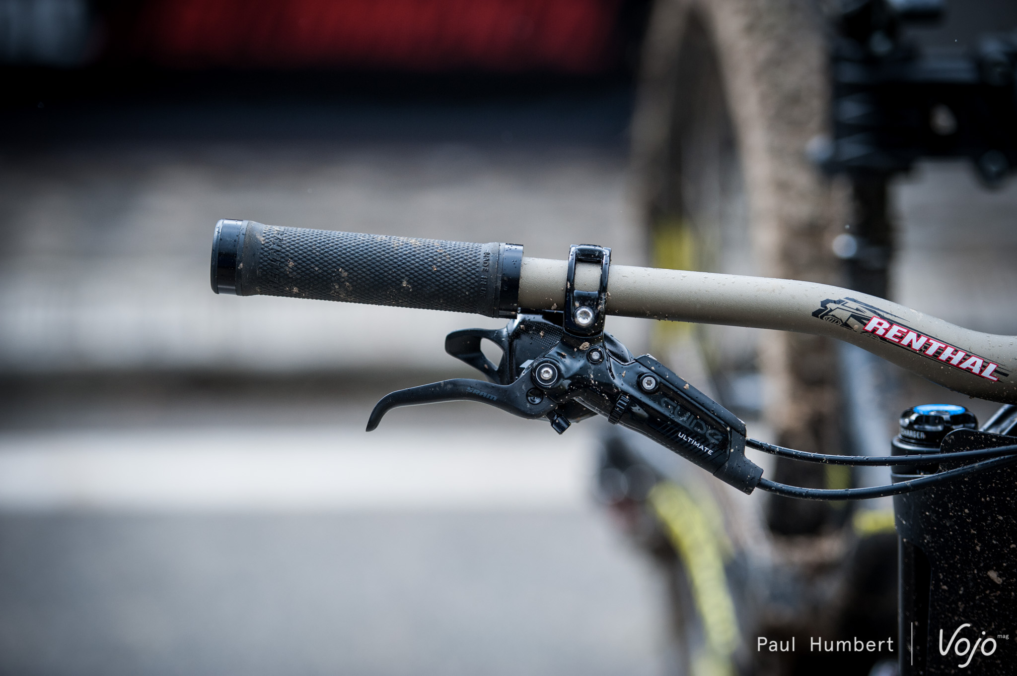 Côté freinage, le pilote Commencal associe une commande de Sram Guide Ultimate et un étrier Avid Code. Le guidon Renthal de Rémi affiche 770mm de large et un rise de 30mm.