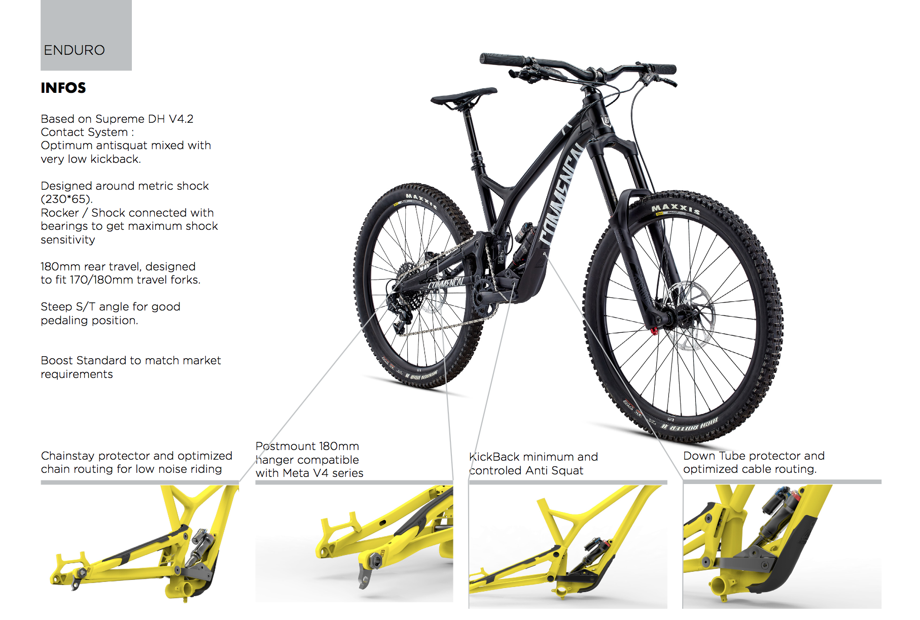 « Au départ, cette suspension a été développée pour un enduro de 160mm de débattement, avant de finalement aboutir sur notre vélo de DH. Les avantages d’un tel système sont nombreux : optimisation de la trajectoire de la roue à l’impact, réduction des effets de chaine pour un amortissement plus libre en passant par une gestion de l’Anti-Squat efficace pour un meilleur pédalage, » explique-t-on chez Commencal.