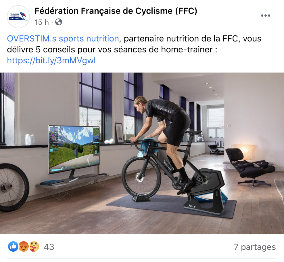 Quasiment au même moment, il est piquant de constater que la Fédération Francaise de Cyclisme (FFC) partageait sur sa page Facebook un post intitulé « la FFC, vous délivre 5 conseils pour vos séances de home-trainer » en collaboration avec son partenaire Overstim’s. Tout un symbole…
