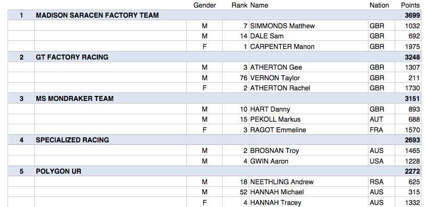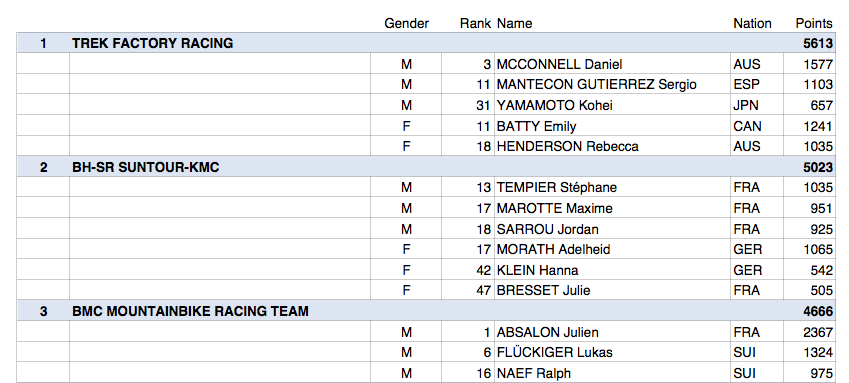 Le nombre de pays dont ces teams sont originaires est également en augmentation avec 33 nations représentées contre 31 en 2014 et 27 en 2013. Il est intéressant de noter que quatre pays sont représentés pour la première fois : la Chine (avec l’étoile filante des JO de Pekin Ren Chenguyang), l’Indonésie, l’Iran et Israël. Parmi ces 130 équipes, les 15 meilleures des catégories XC et DH ont été invitées à rejoindre la catégorie « Elite » avec divers avantages à la clé comme l’inscription gratuite aux épreuves du calendrier UCI, etc. En consultant la liste, on constate que l’équipe Trek Factory Racing pointe à la 1e place avec des coureurs comme Mc Connell, Emilie Batty ou le japonais Yamamoto transféré de chez Specialized. BH-Suntour-KMC pointe 2e avec son écurie majoritairement française (Marotte, Tempier, Sarrou, Bresset,…), juste devant BMC qui présente un excellent ratio points/coureurs grâce au trio Absalon, Flückiger et Naef. Suivent ensuite Multivan Merida, Scott-Odlo, Specialized et Stöckli (qui détient le record du ratio points/coureurs avec seulement 2 noms, mais non des moindres : Jolanda Neff et Mathias Flückiger). Si la plupart des grands transferts avaient déjà été annoncés, c’est l’occasion d’avoir une vue globale et de se rappeler notamment que Florian Vogel rebondit chez Focus, que Margot Moschetti roulera pour Betch.nl/Superior/Brentjens ou encore que Fabian Giger portera les couleurs Colnago. Au niveau français, outre les tricolores présents dans des teams internationaux, on note que Pauline Ferrand Prevot amène à elle toute seule le team Liv-Giant à la 31e place. Calvisson VTT pointe 47e, Veloroc BMC 61e et BTwin 64e. Côté belge, Ruben Scheire est le mieux classé (45e) et roulera pour le nouveau team Habitat, 9e grâce principalement à des filles comme Blaza Klemencic ou Anne Terpstra. Le team Versluys de Kevin Van Hoovels et Githa Michiels est 21e, alors que le team Merida-Wallonie de Sébastien Carabin, Pieter Geluykens et Alice Pirard est 27e. En DH, le team Madison-Saracen de la championne du Monde Manon Carpenter occupe la 1e place devant le GT-Factory Racing de la famille Atherton et le nouveau MS-Mondraker team qui a recruté Danny Hart et Emmeline Ragot cet hiver pour revenir au top. Au niveau Français, Commençal-Vallnord pointe à la 6e place avec Rémi Thirion, Myriam Nicole et Thibaut Ruffin. Parmi les teams de DH, une absence de taille : le Santa Cruz Syndicate de Bryceland, Minnaar et Peat, qui n’a pas été accepté parmi les teams Elite par l’UCI à cause de maillots et sponsors différents pour ses coureurs, comme la expliqué Kathy Sessler à nos confrères de Vélo Vert. En attendant le début de la saison 2015, voici une vidéo pour revivre les meilleurs moments de l’année 2014 ! Pour retrouver la liste complète des teams , rendez-vous sur le site de l’UCI : les teams XC – les teams DH