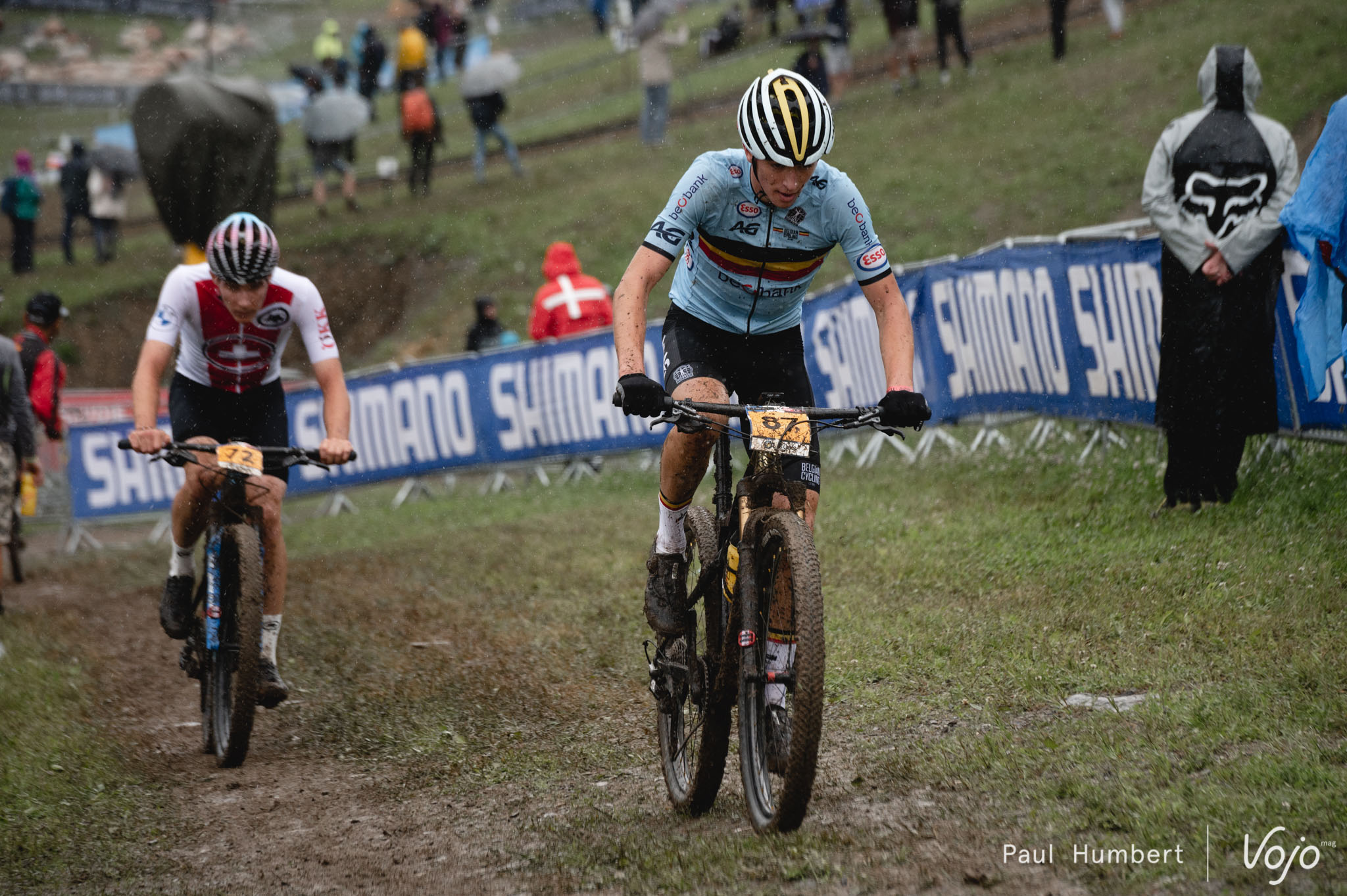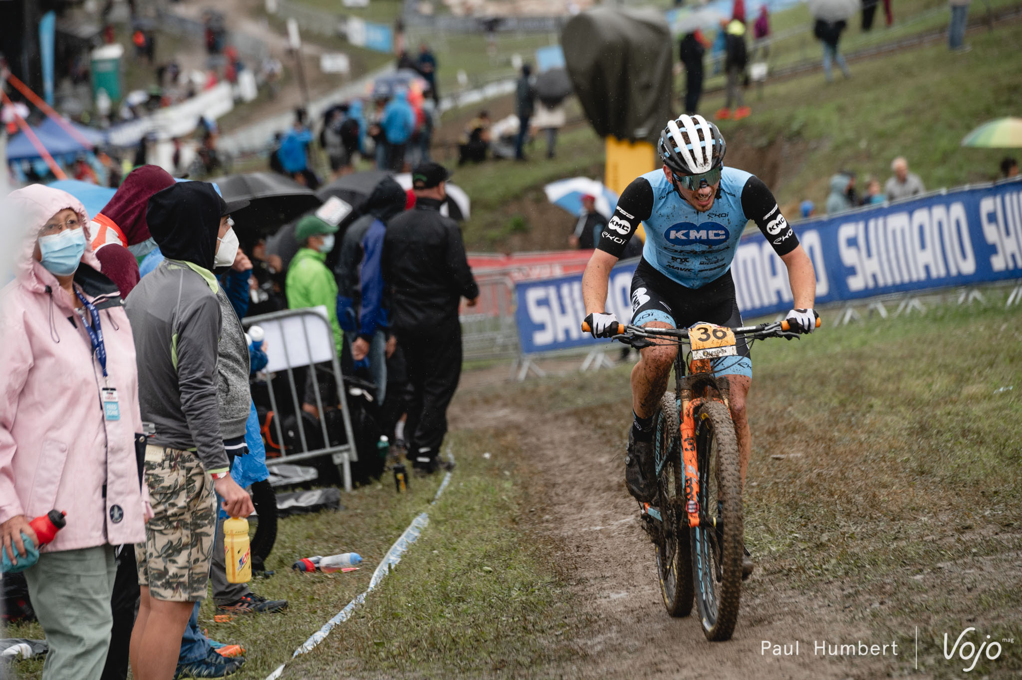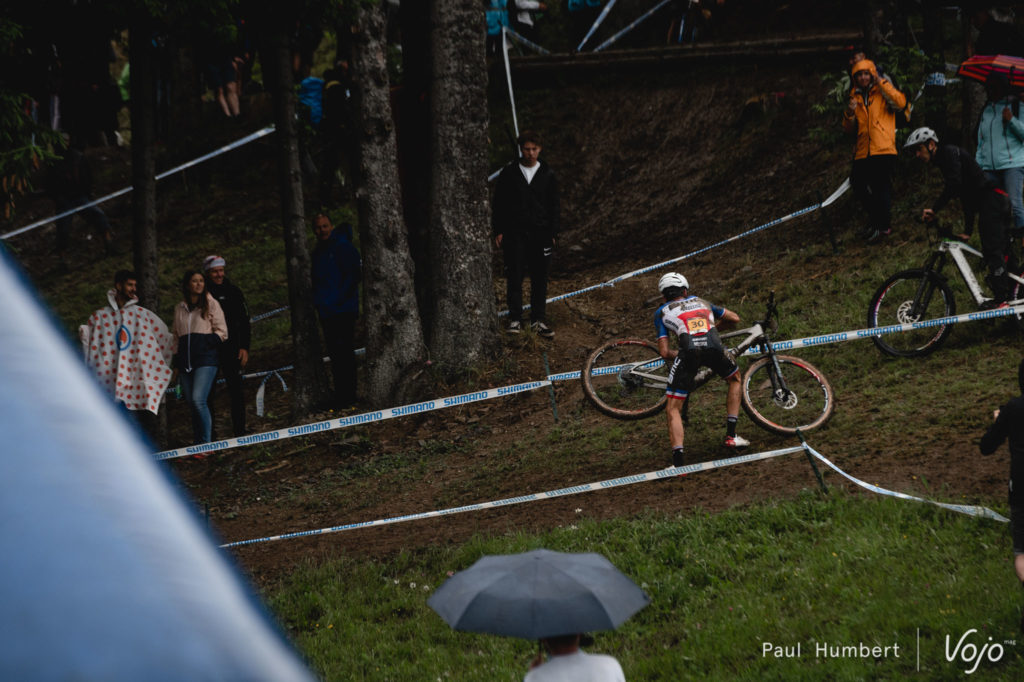 Leurs homologues masculins n’ont pas eu la même chance avec la météo puisque la pluie s’est invitée dès la mi-course, avec un peu d’avance sur les prévisions. Et cette fois, ce n’était pas une petite pluie fine comme hier une bonne partie de l’après-midi pour la DH mais une vraie pluie bien présente, qui a très vite eu un impact sur le circuit. On a ainsi vu des pilotes descendre de vélo pour passer certaines épingles en montée dans l’herbe et se remettre en selle aussitôt derrière, une technique qu’on a plus l’habitude de voir en cyclocross qu’en VTT.