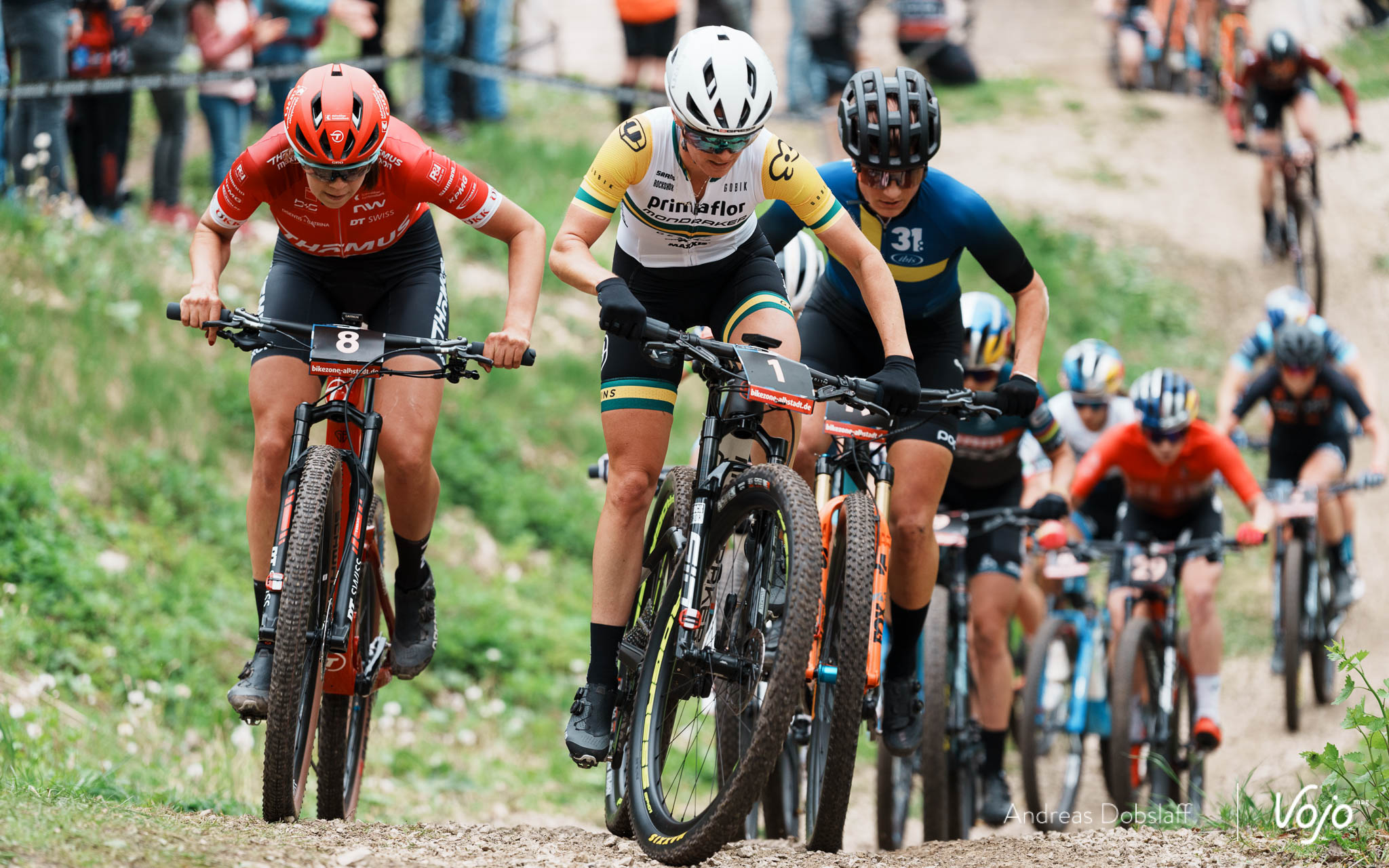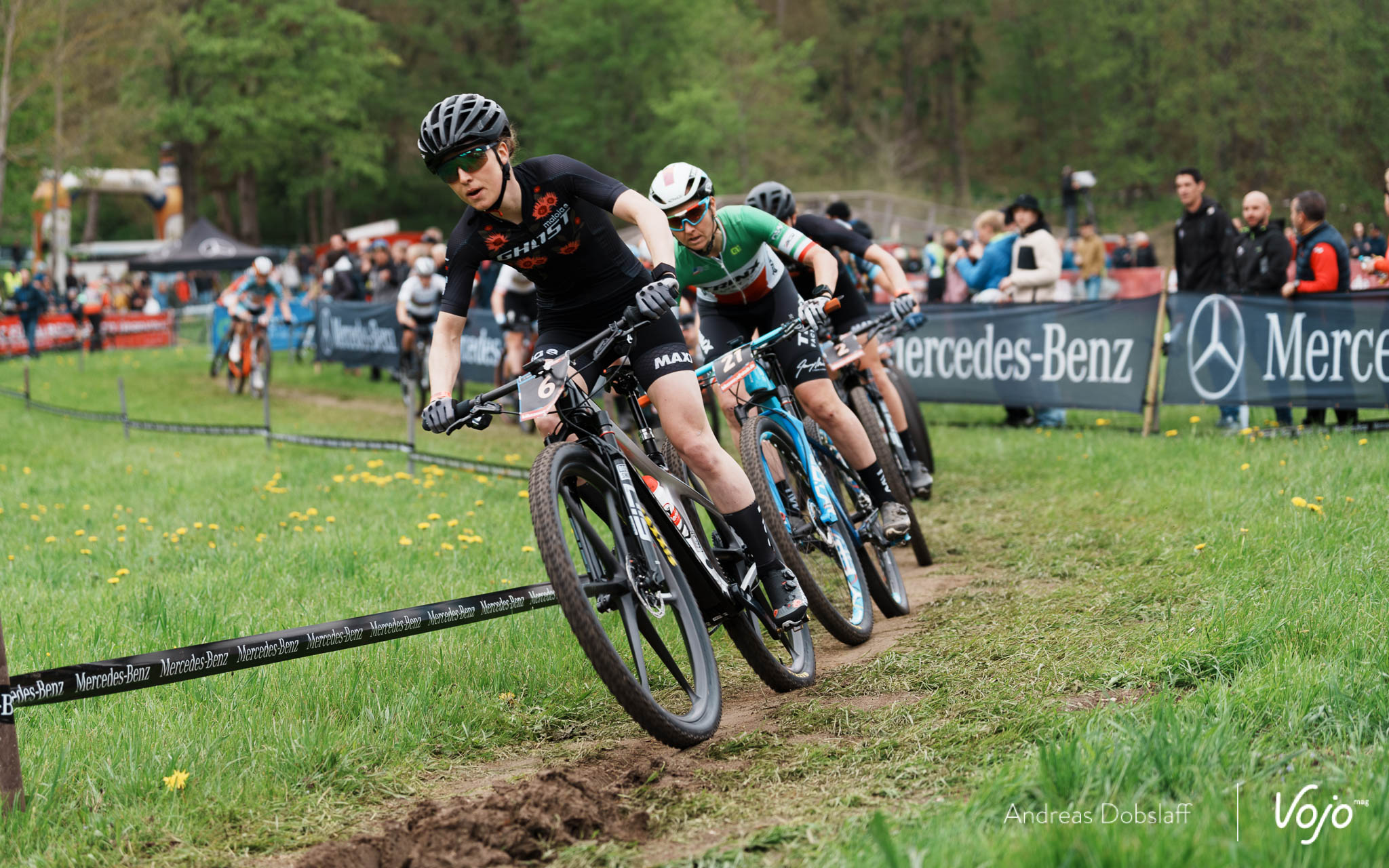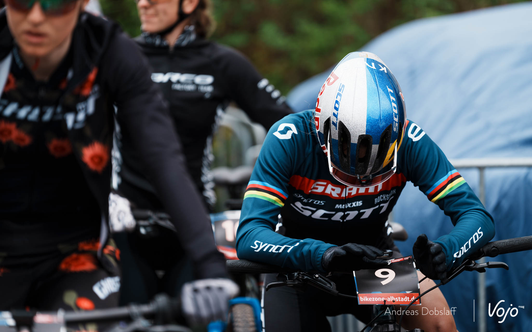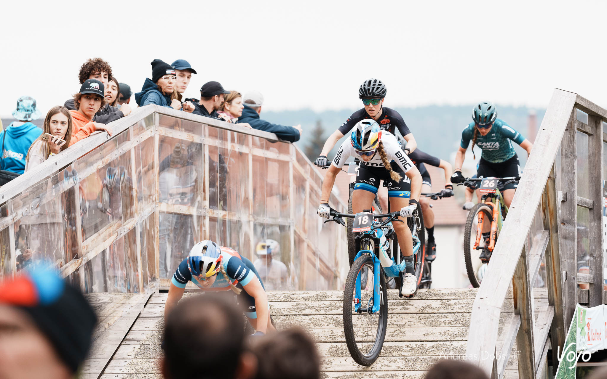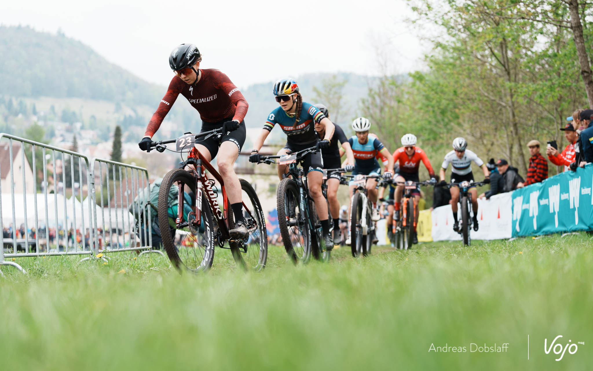 Avec une longue portion en singletrack, il n’est pas toujours évident de doubler sur le circuit d’Albstadt et ce n’est qu’à la fin du troisième tour que la championne d’Europe et leader du classement général du XCC parviendra à recoller au groupe de tête, composé d’une grosse douzaine de pilotes.