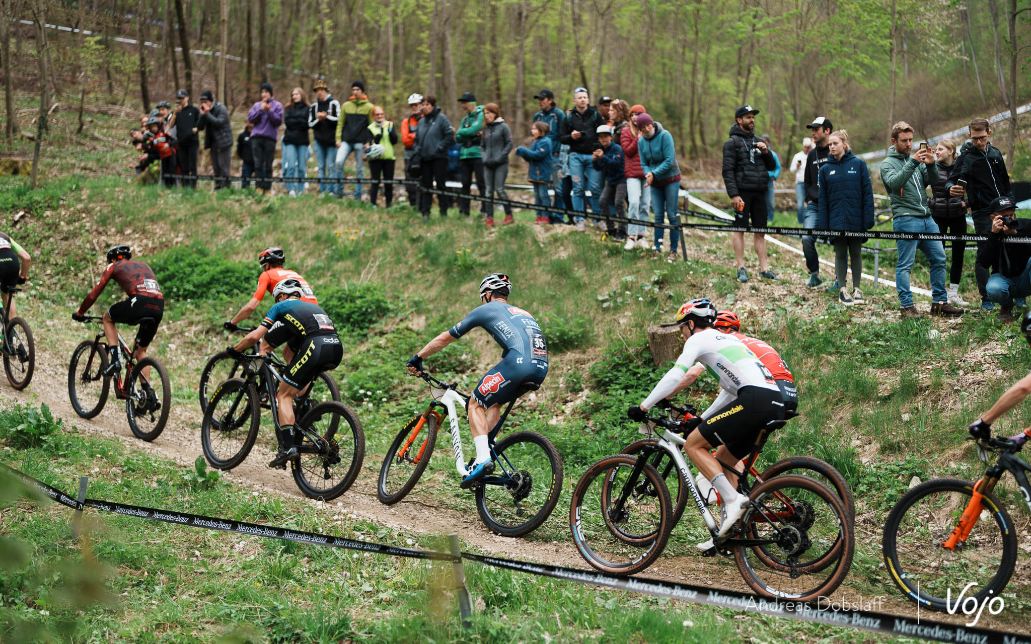 Le duo poursuit son effort pendant deux tours, avant que l’allure ne ralentissent finalement au début du troisième tour. C’est le moment choisi par Luca Schwarzbauer pour se porter en tête devant son public, suivi par Victor Koretsky, Tom Pidcock et Nino Schurter.