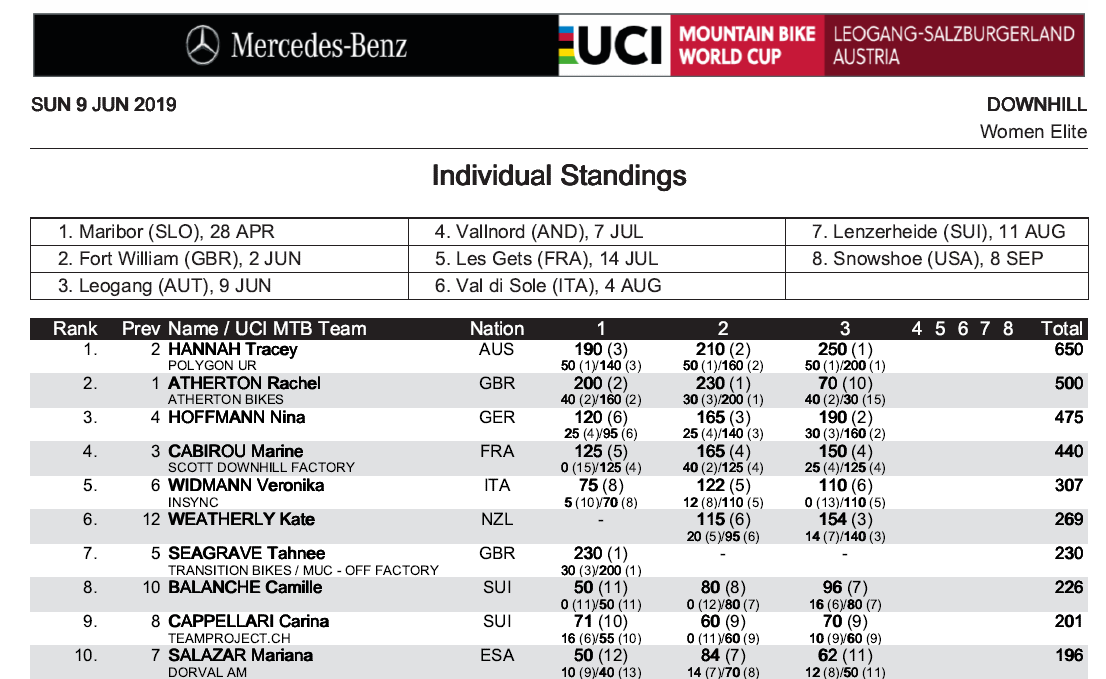 Chez les femmes, le classement est moins serré mais tout aussi ouvert avec 3 vainqueures en 3 manches. Après avoir échoué par deux fois à concrétiser sa première place des qualifications, Tracey Hannah a finalement remporté la finale à Leogang. C’était sa 4e victoire en coupe du monde, 2 ans après la précédente (déjà à Leogang, en 2017).