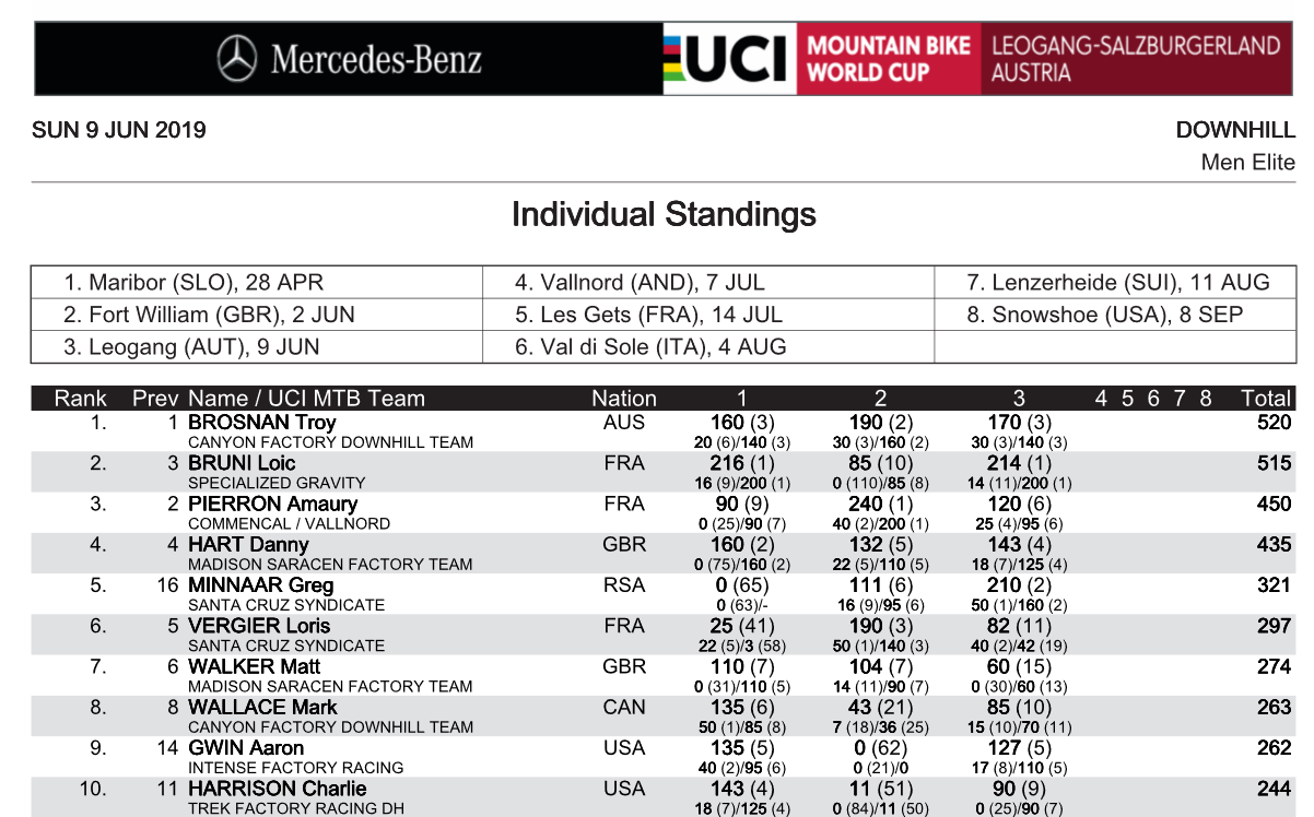 Malgré leur excellent début saison collectif, ce n’est pas un français qu’on retrouve en tête du classement général mais Troy Brosnan. Impressionnant de régularité, l’Australien mène mais il ne dispose que de 5 unités d’avance sur Loïc Bruni. Ces deux-là ont un peu d’avance sur la troisième place, actuellement occupée par Amaury Pierron. Néanmoins, ce dernier n’a que 15 points d’avance sur Danny Hart donc rien n’est encore figé.