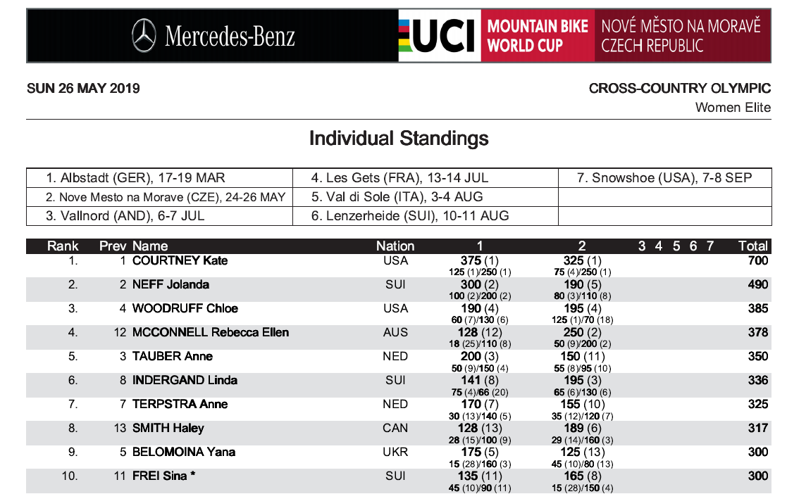 Chez les femmes, Kate Courtney fait preuve d’une grande maturité pour sa deuxième saison chez les Elites. Si son titre l’année dernière en avait surpris plus d’un, elle montre cette année que ce n’était pas dû au hasard. A l’aise dans toutes les situations, elle a ainsi remporté le short-track d’Albstadt au sprint puis la course principale après un long cavalier seul. A Nove Mesto, elle a tiré parti des crevaisons de Jolanda Neff et Anne Tauber dans le dernier tour pour s’imposer au terme d’une formidable remontée, après avoir elle-même crevé dans le premier tour.