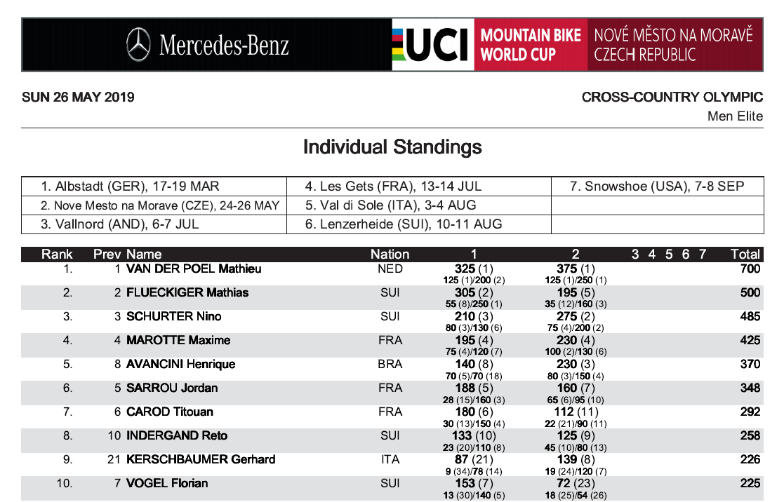 Cependant, MVDP ne disputera que 3 des 5 manches restantes et à moins d’un concours de circonstances extrêmement favorable, la coupe du monde devrait donc lui échapper. Les deux concurrents les plus proches au classement général sont actuellement Matthias Flüeckiger et Nino Schurter mais les écarts sont faibles et aucune position n’est figée.