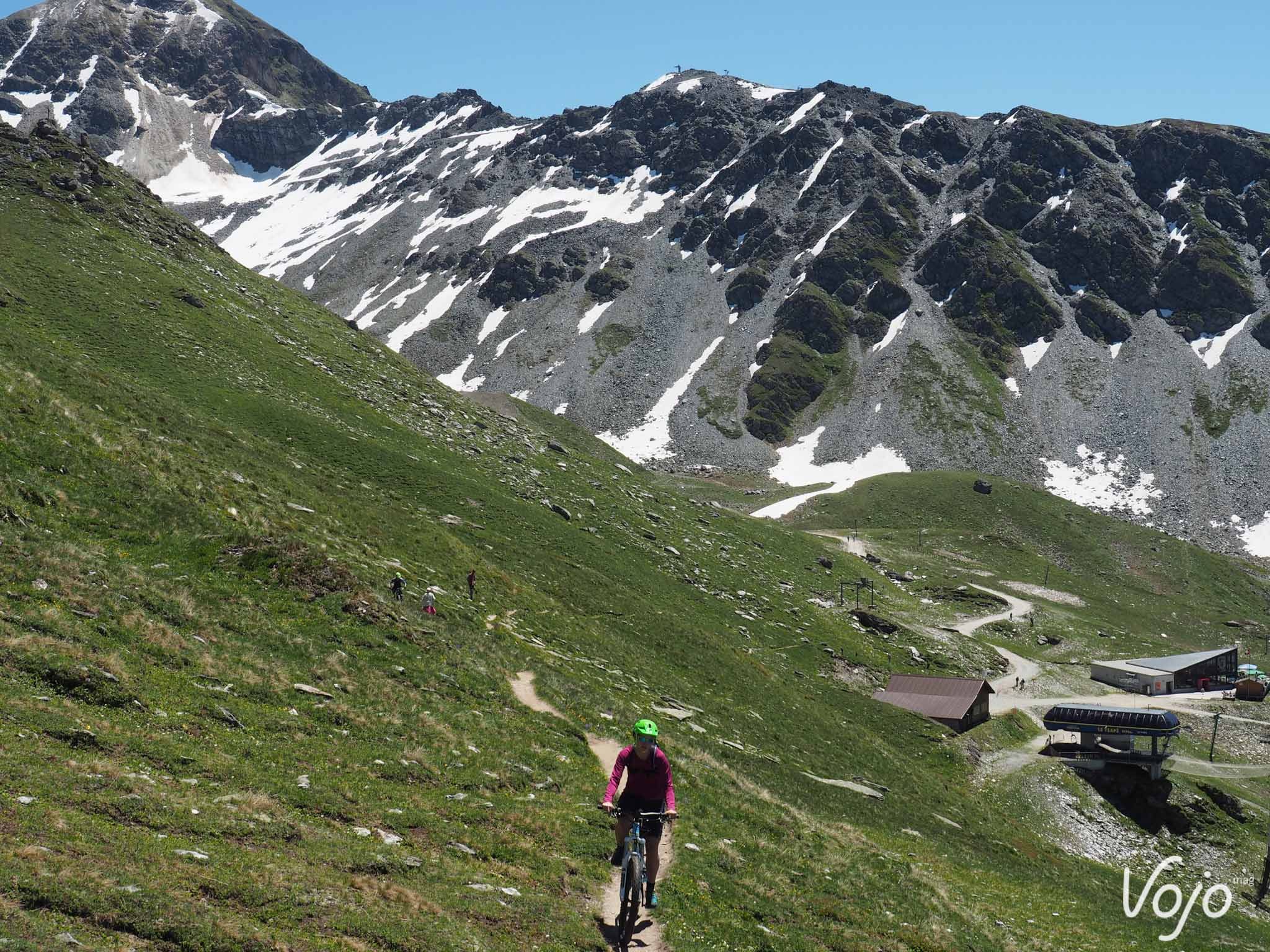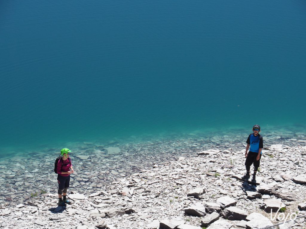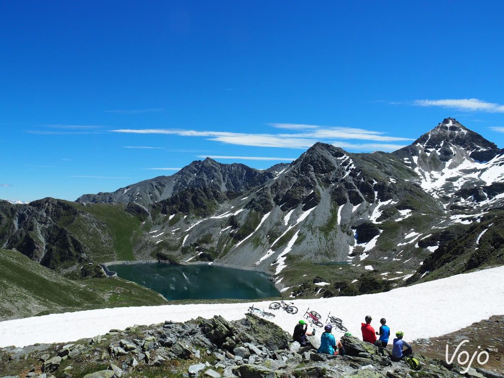 Après ce petit bain rafraichissant, il va falloir faire travailler les biscotos et porter les vélos une vingtaine de minutes pour arriver au départ de la maxi descente. Et quelle belle récompense, on a l’impression d’être hors du temps ! Une nouvelle vue sur des lacs s’offre à nous, en plus de la vue panoramique sur la vallée du Rhône. A partir de là, une descente de 2000m de dénivelé négatif nous attend.