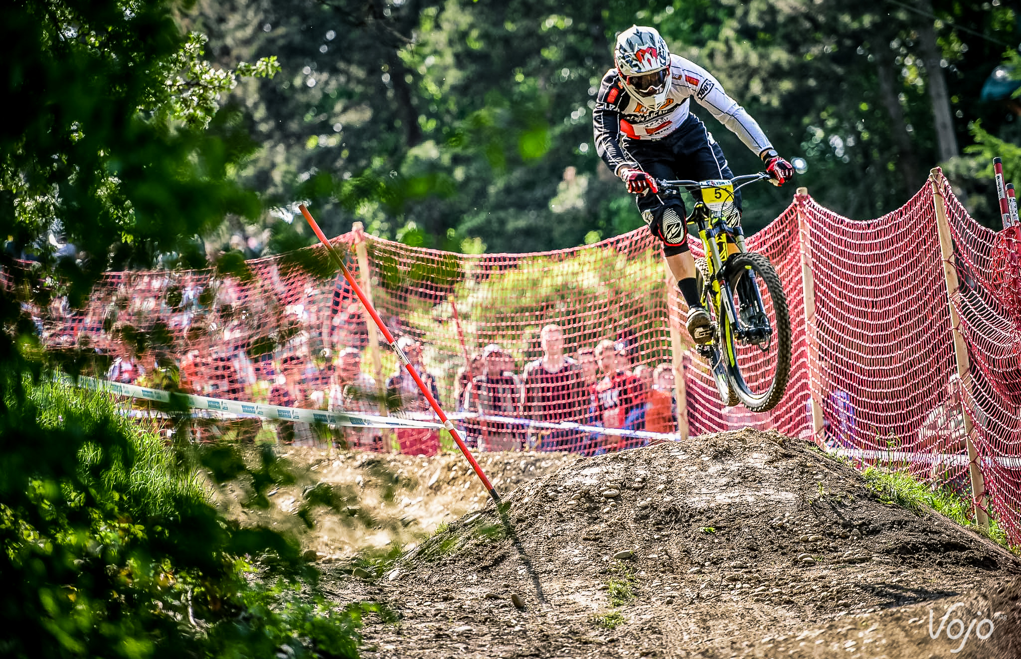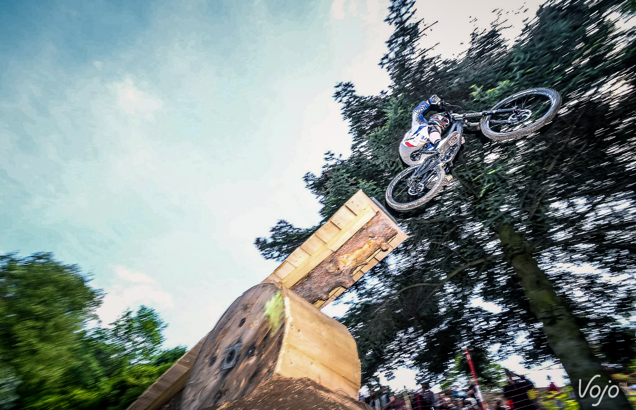 Plus rapide, mais aussi cassante, aérienne et spectaculaire, elle était censée couronner un spécialiste de la DH au guidon d’un gros vélo (dixit la FFC dans un précédent communiqué)… et c’est raté : Quentin Derbier (ci-dessous) l’emporte d’un cheveu après avoir pris son Nicolai de 4X pour la finale ! Les modifications du tracé n’ont donc pas empêché ce grand spécialiste de l’Avalanche Cup, déjà vainqueur en 2014, de s’imposer à nouveau.