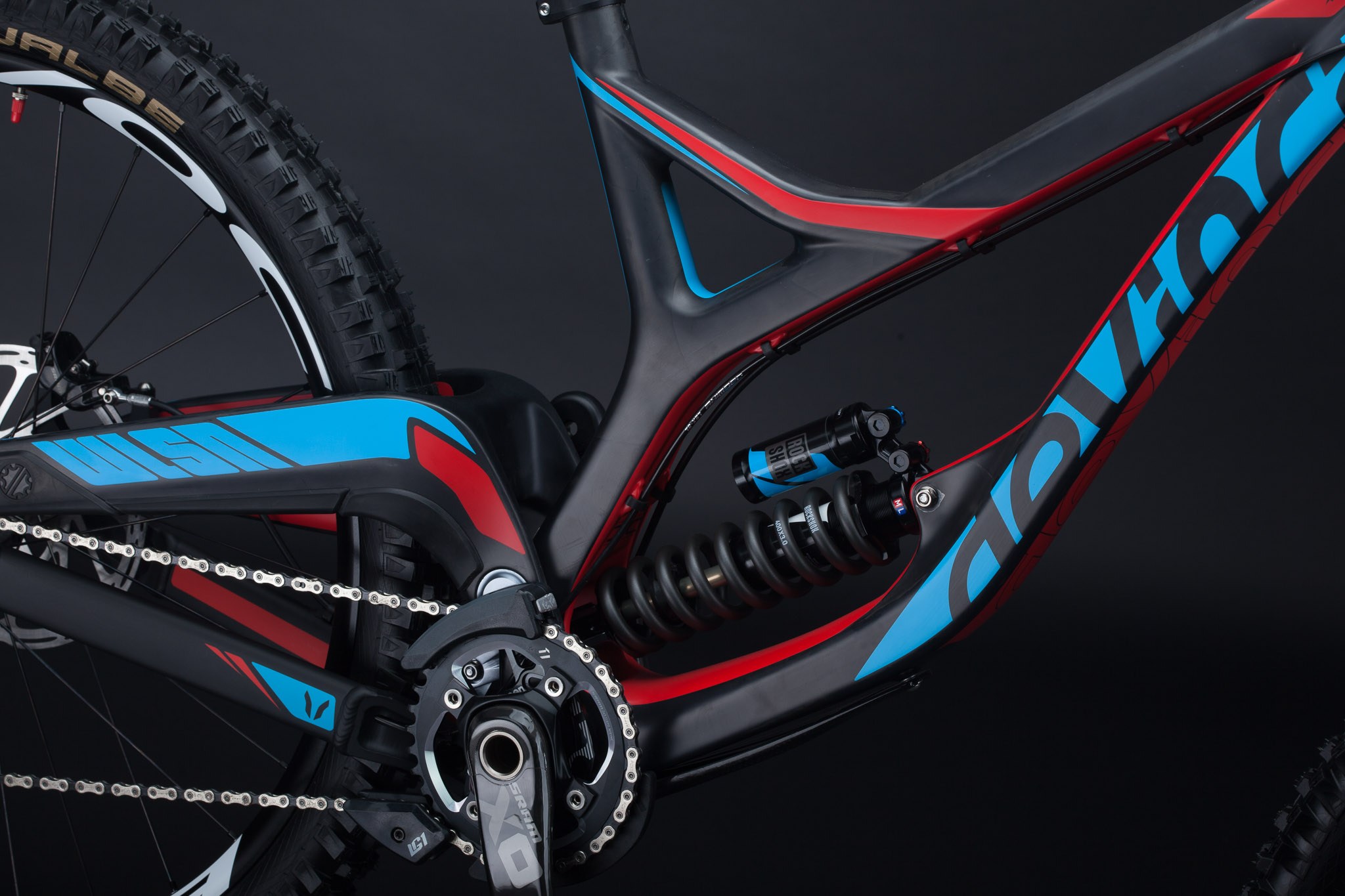 Le DeVinci Wilson Carbon est identique à l’aluminium au niveau de la géométrie et de la cinématique de suspension, le fameux Split Pivot mis au point par Dave Weagle et qui est utilisé sur toute la gamme de la marque Canadienne. Comme sur les autres modèles enduro/Trail, les bases restent en aluminium. Les haubans, très massifs, sont par contre spécifiques et présentent un design asymétrique.