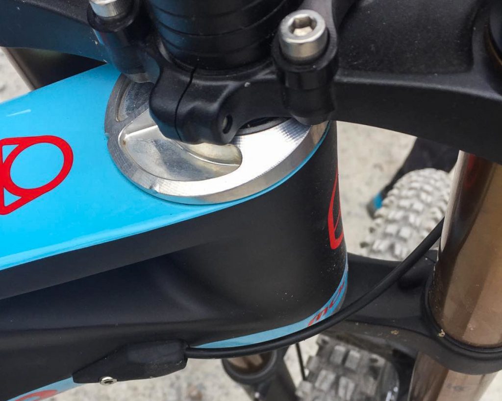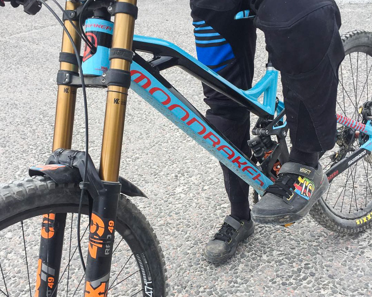 Malgré sa petite taille, Danny Hart l’a essayé et il semble conquis. Notez aussi une autre nouvelle tendance en DH : le jeu de direction permettant de faire varier le reach (la longueur) du cadre sans toucher à l’angle de fourche.
