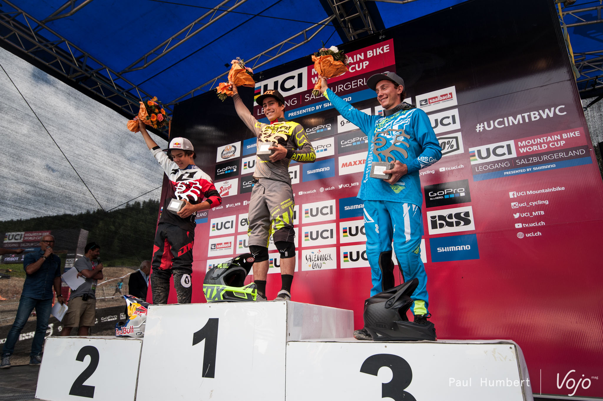 Après avoir montré son bon état de forme lors des entraînements chronométrés, Gaëtan Vigé confirme et remporte sa toute première coupe du Monde en catégorie Junior. Il devance Finn Iles et son compatriote du team Les Gets-Intense, Sylvain Cougoureux, qui grimpe sur son premier podium.
