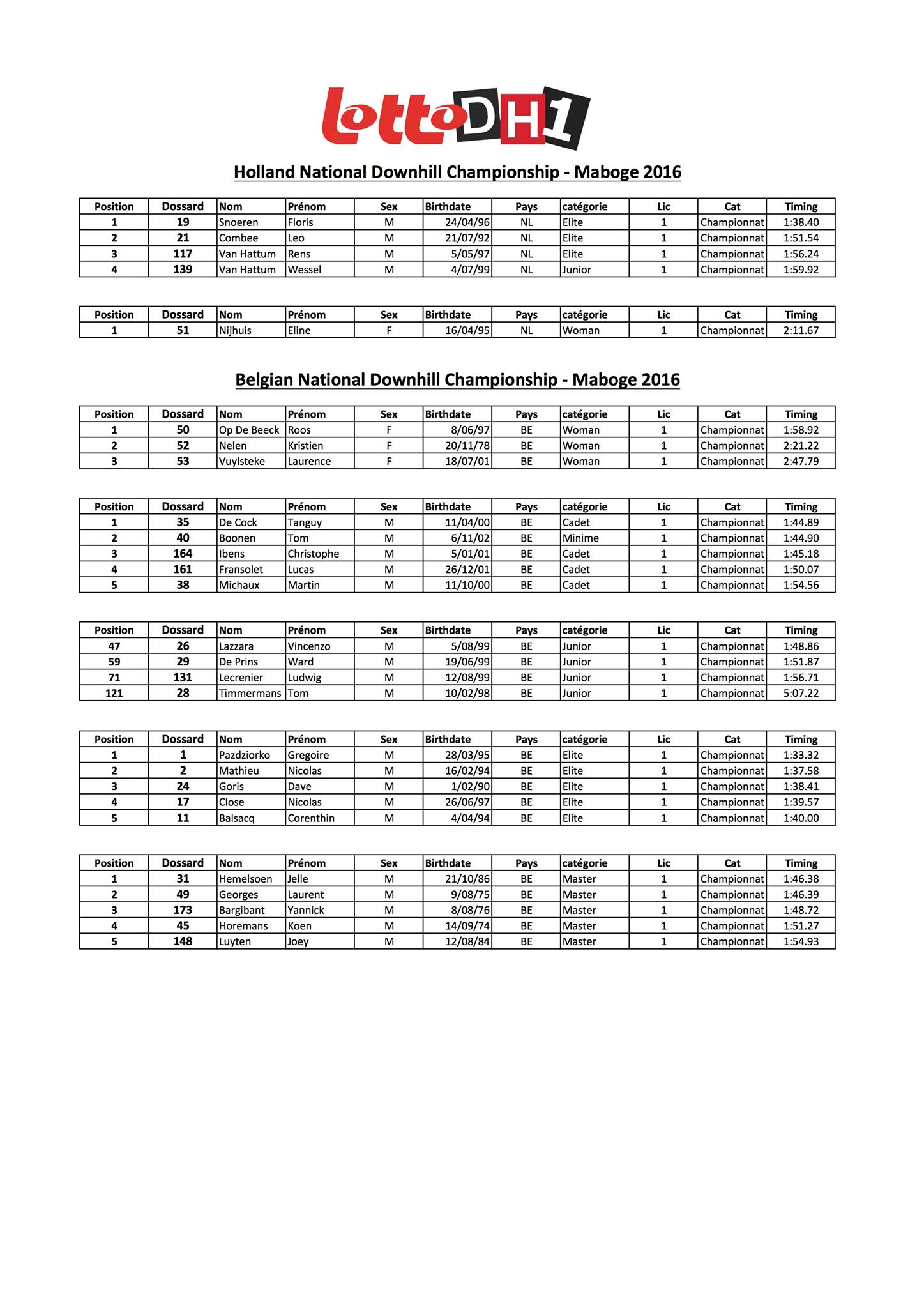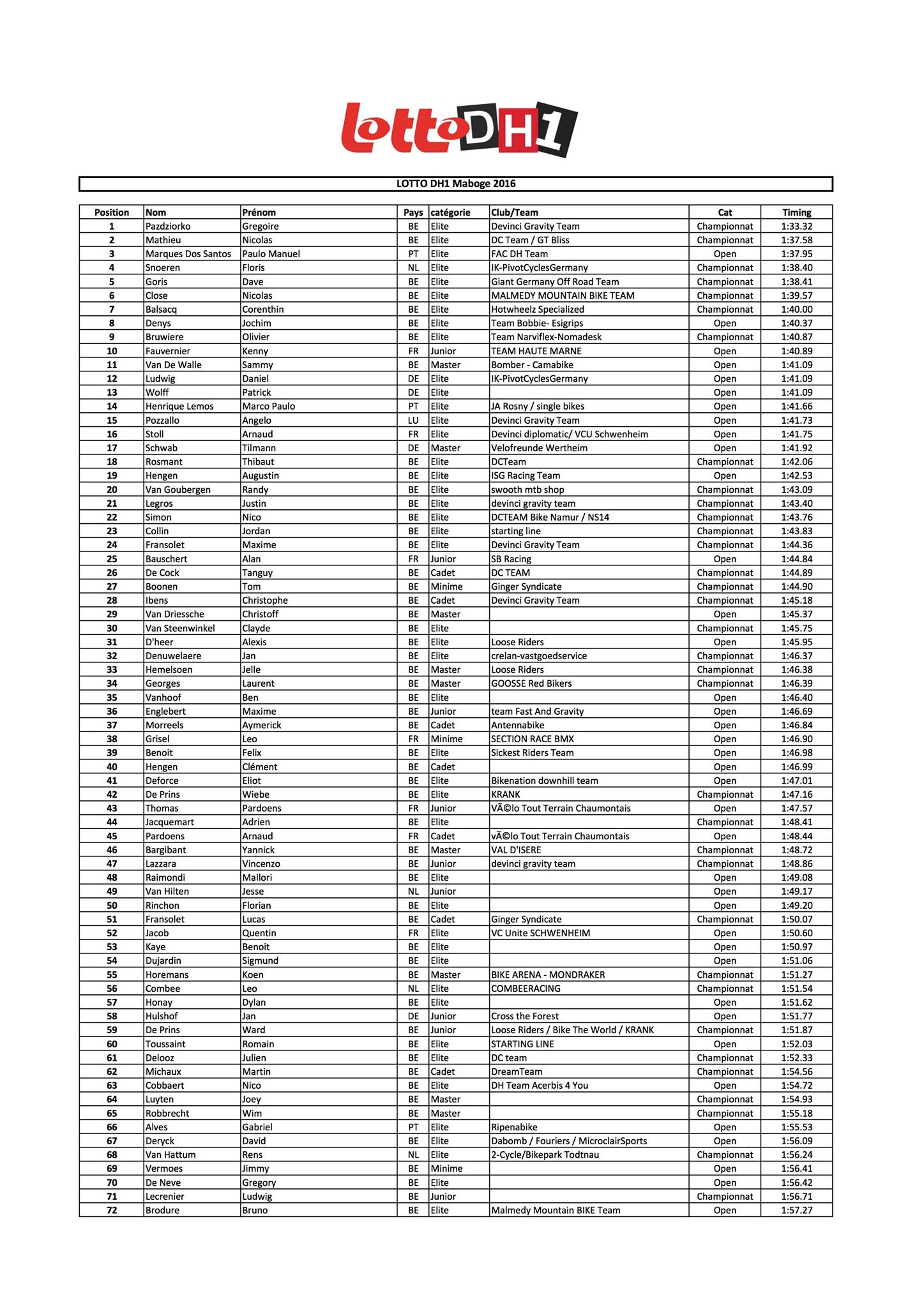 Troisième des cinq manches de la DH1, la coupe de Belgique de descente, Maboge faisait également office de championnat de Belgique et des Pays-Bas. Alors que Nicolas Mathieu avait été sacré à Vielsalm l’année dernière, c’est cette fois Grégoire Pazdziorko qui s’est emparé du maillot noir-jaune-rouge tant convoité. Voici les photos et les résultats complets de la course :