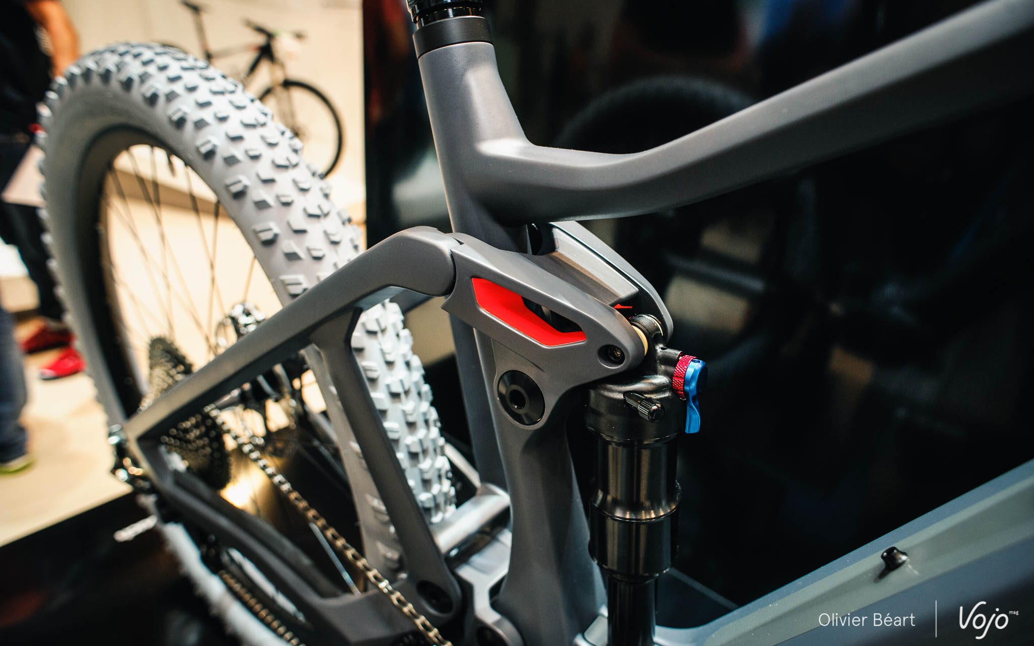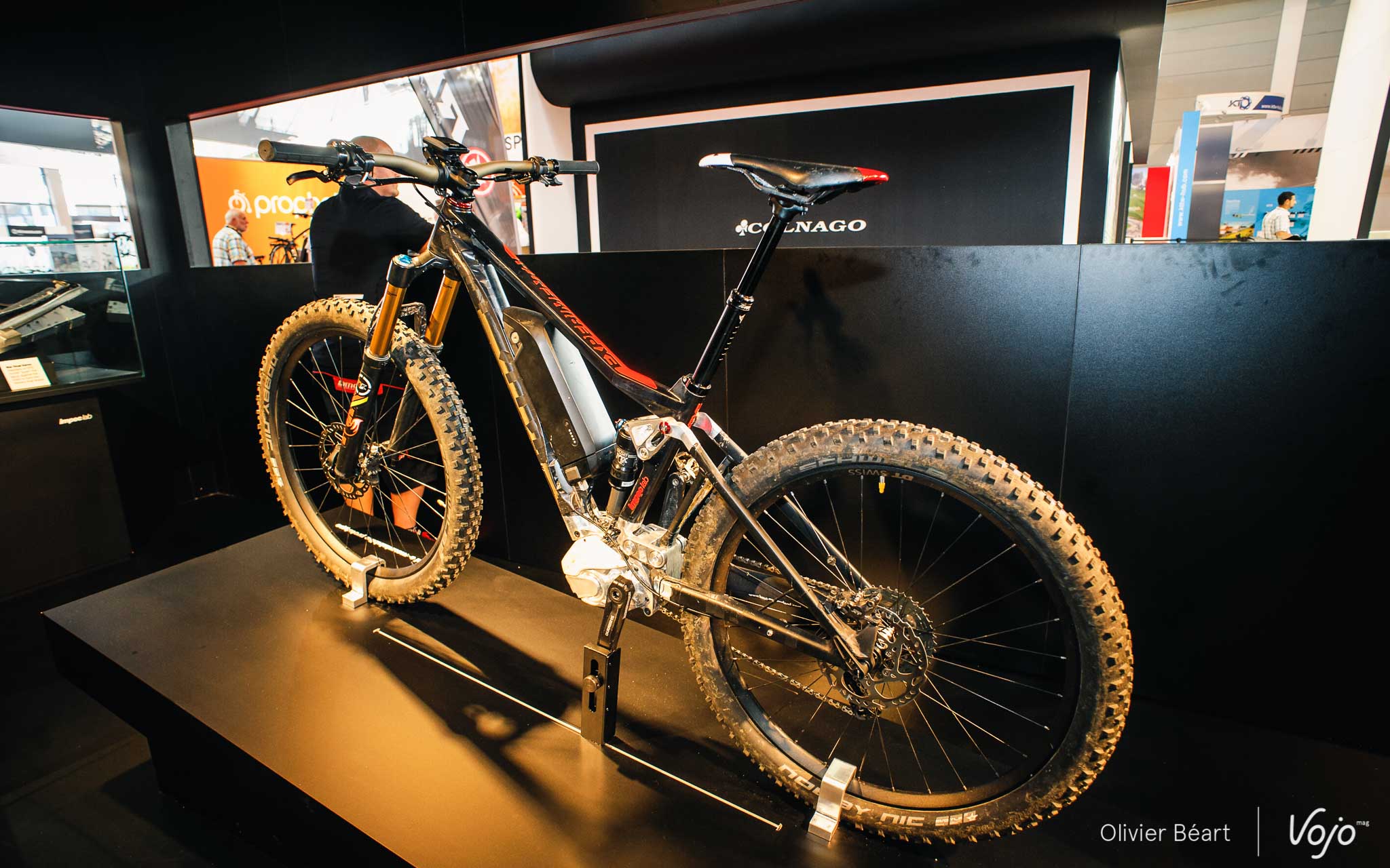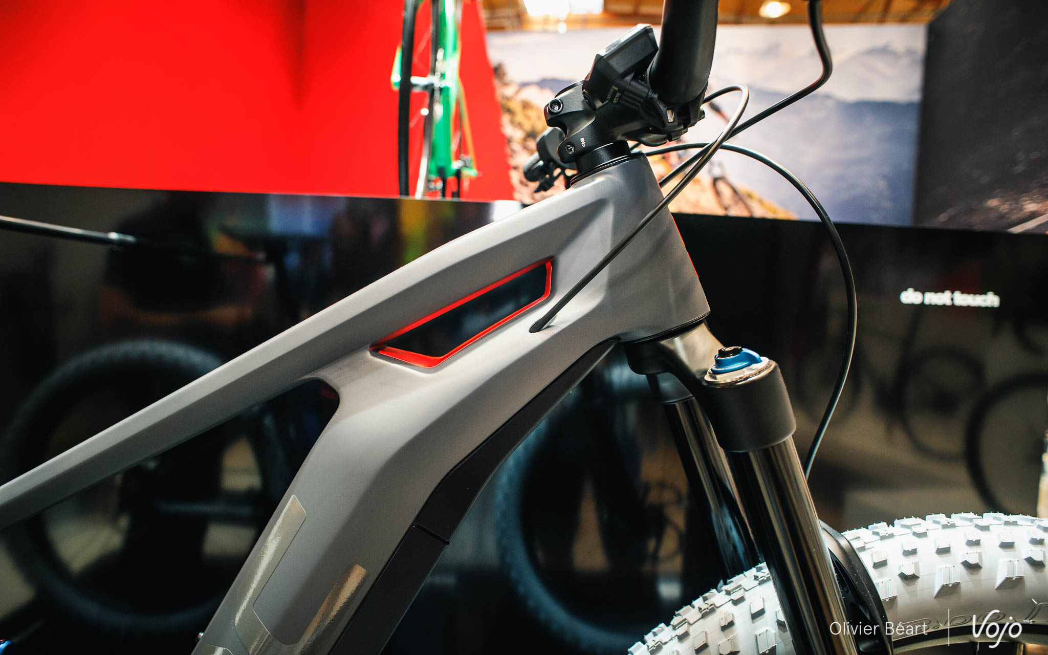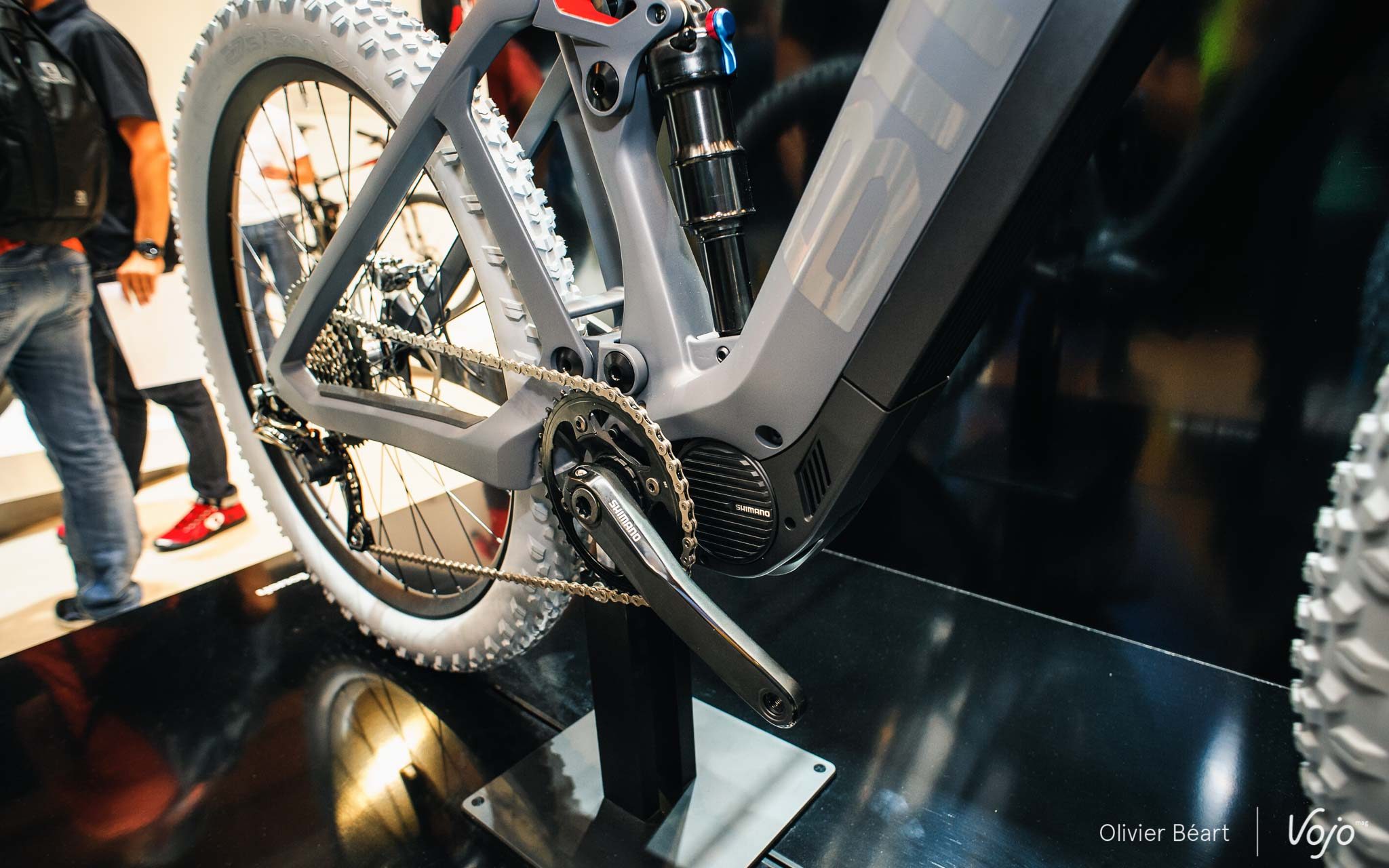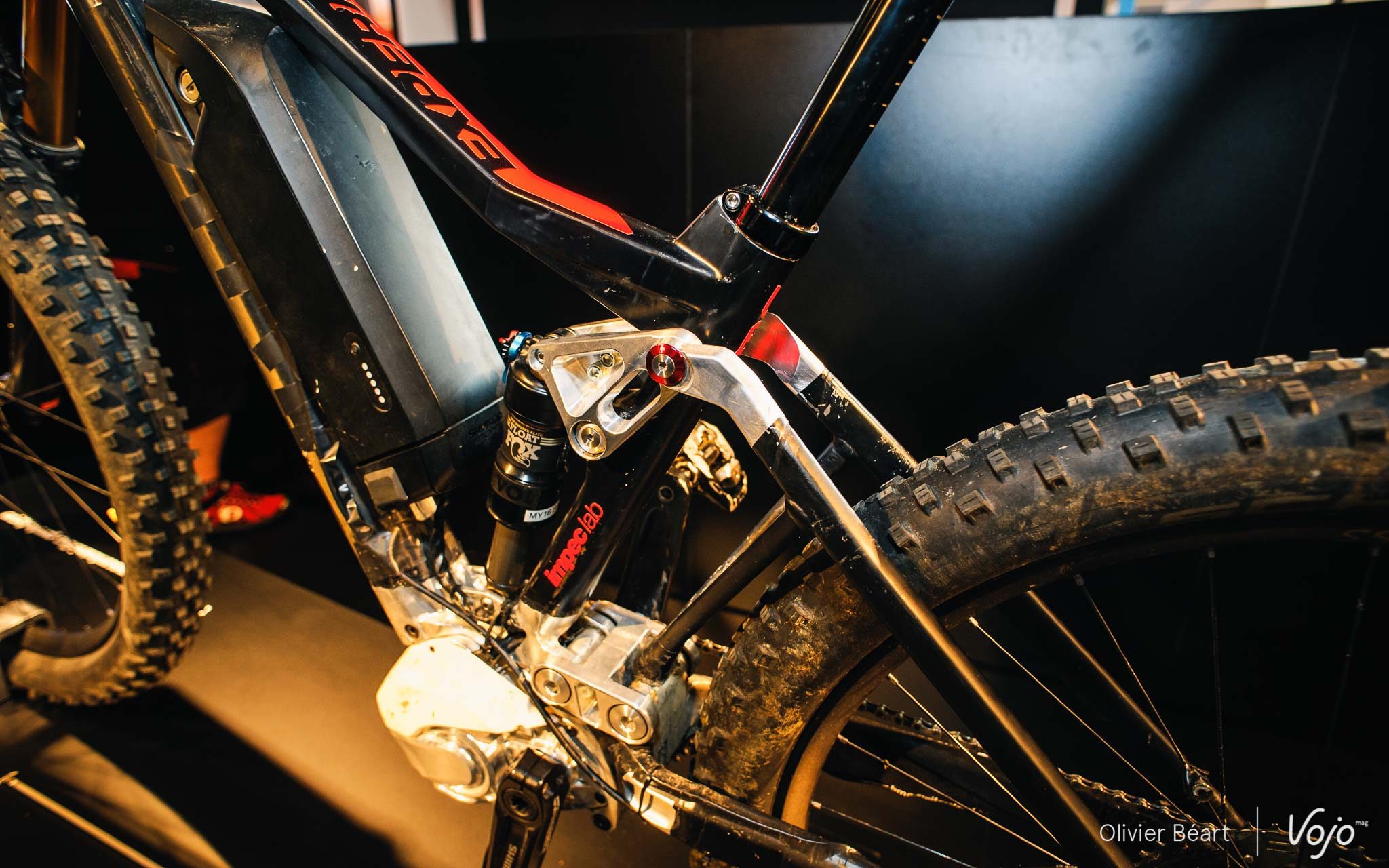 Quelques détails ne seront pas sur le vélo de série, mais les grandes caractéristiques sont là : 150mm de débattement, pneus Plus, triangle avant en carbone, arrière en alu et intégration de la batterie dans le tube diagonal (très volumineux et impressionnant).