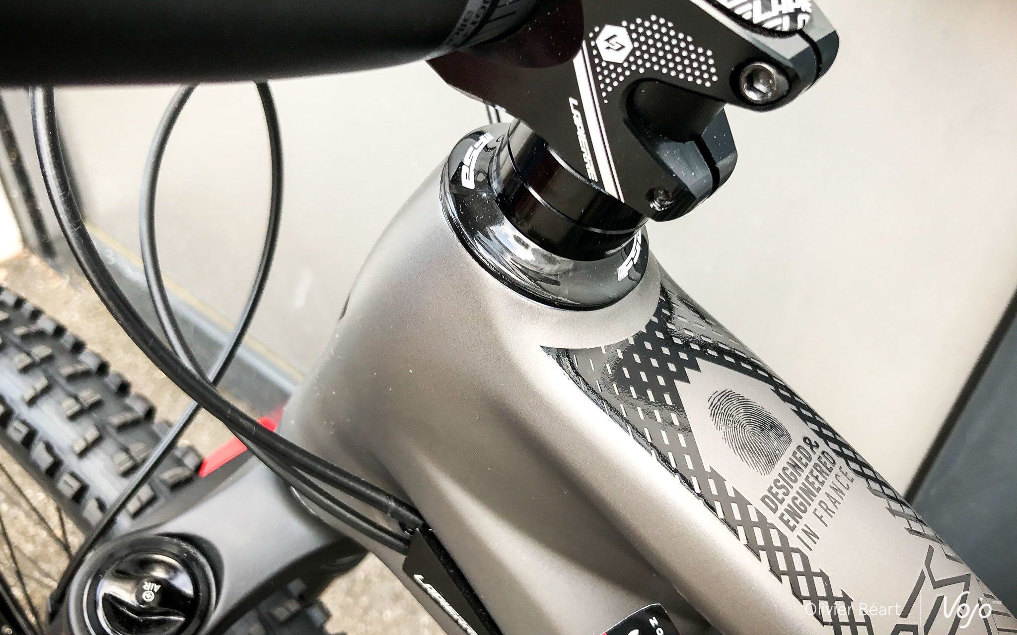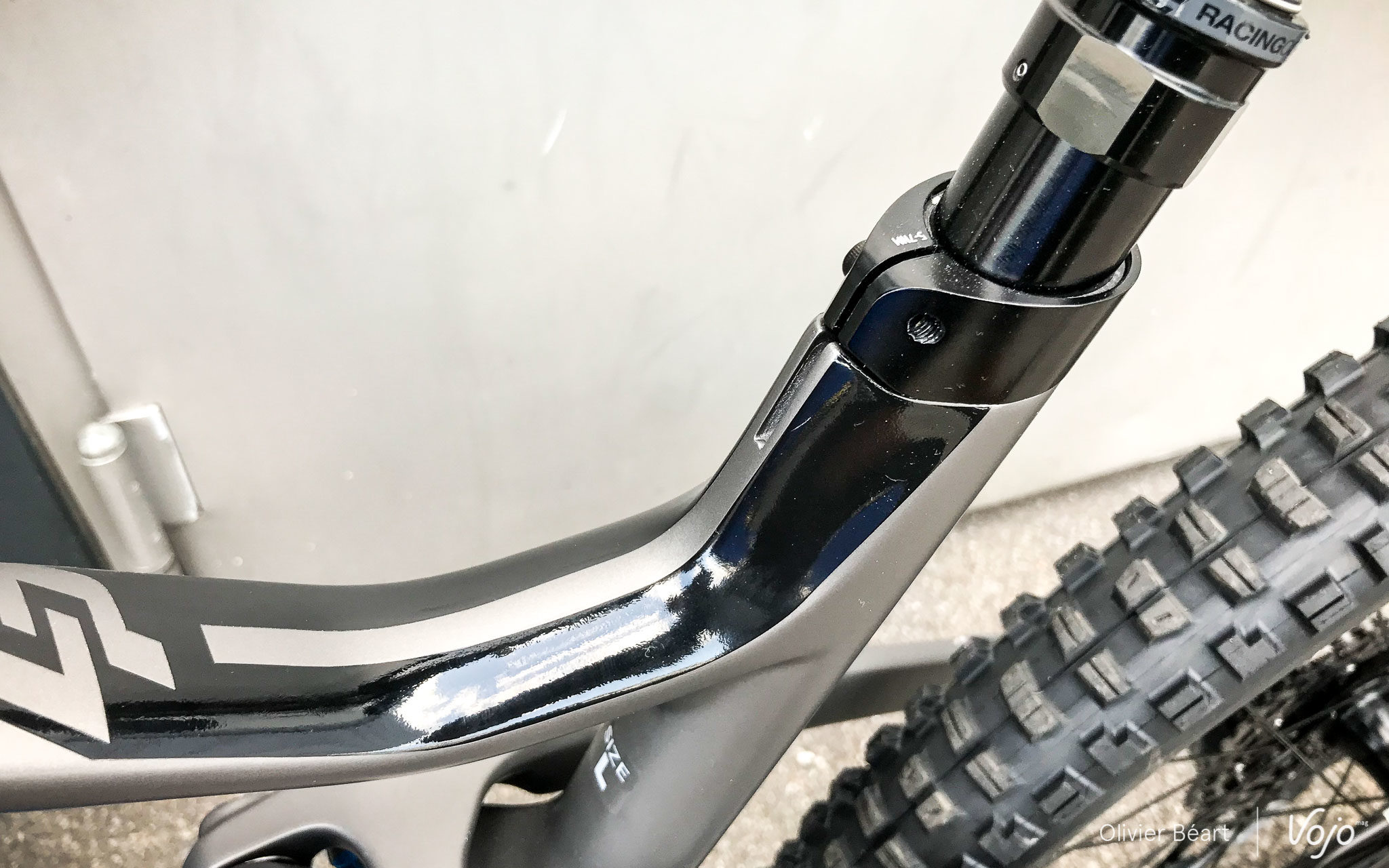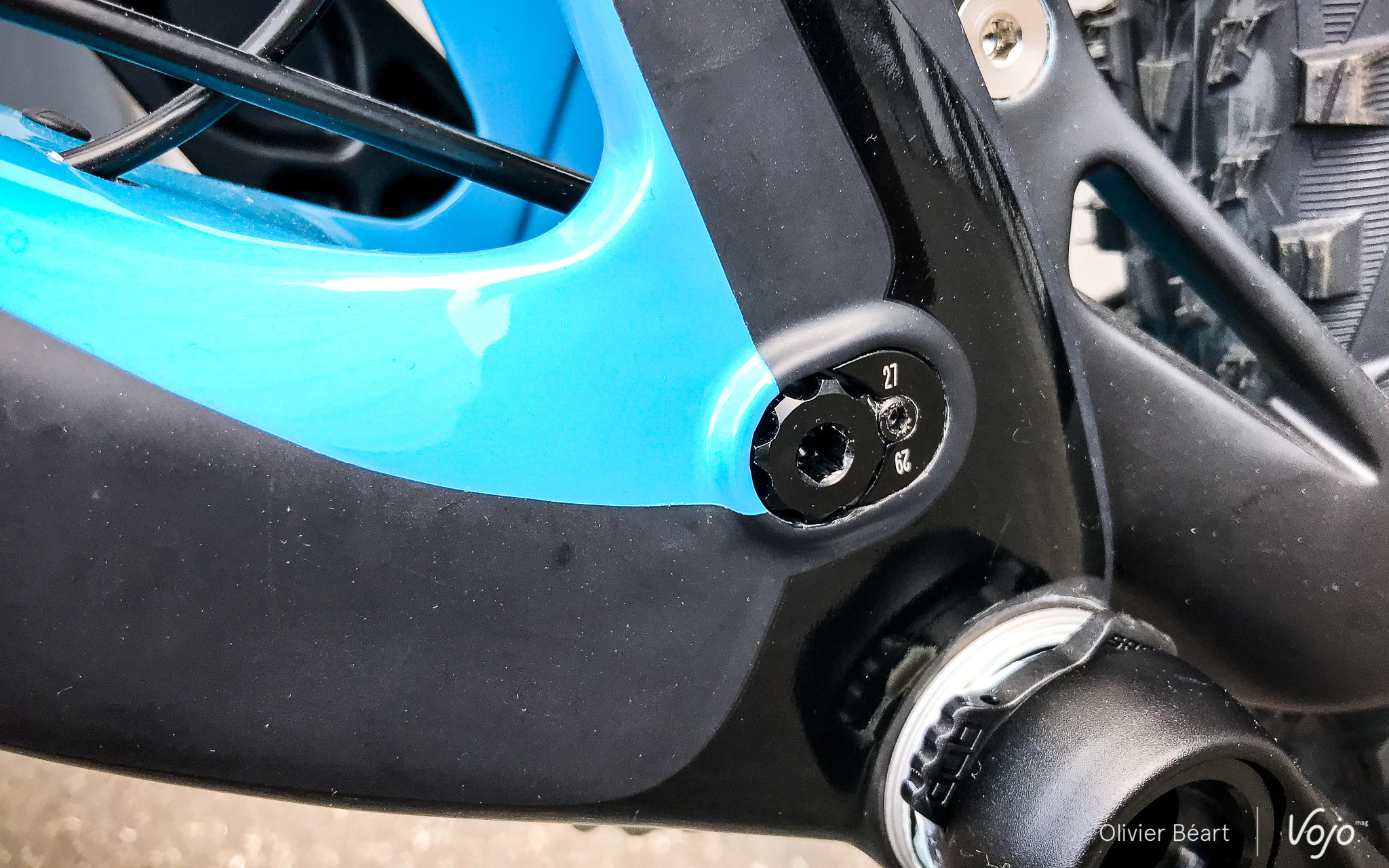 En attendant, on peut déjà vous expliquer concrètement comment cette adaptation aux roues 27,5/29 fonctionne : un petit adaptateur au niveau du boîtier de pédalier permet de changer la hauteur du boîtier et un jeu de direction réversible, type « angle set » permet d’adapter l’angle de direction. La course de l’amortisseur est aussi adaptée. Tout cela est fait en usine, mais un changement a posteriori est aussi envisageable.