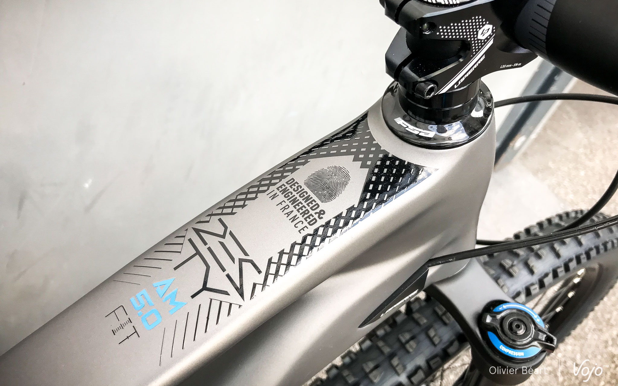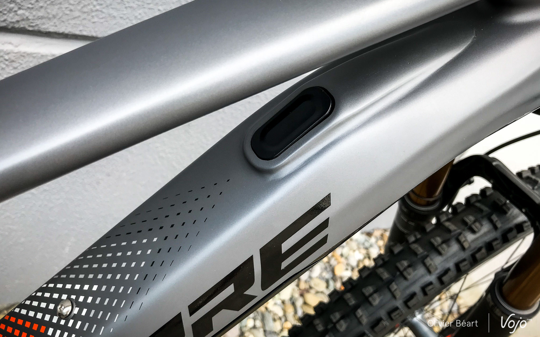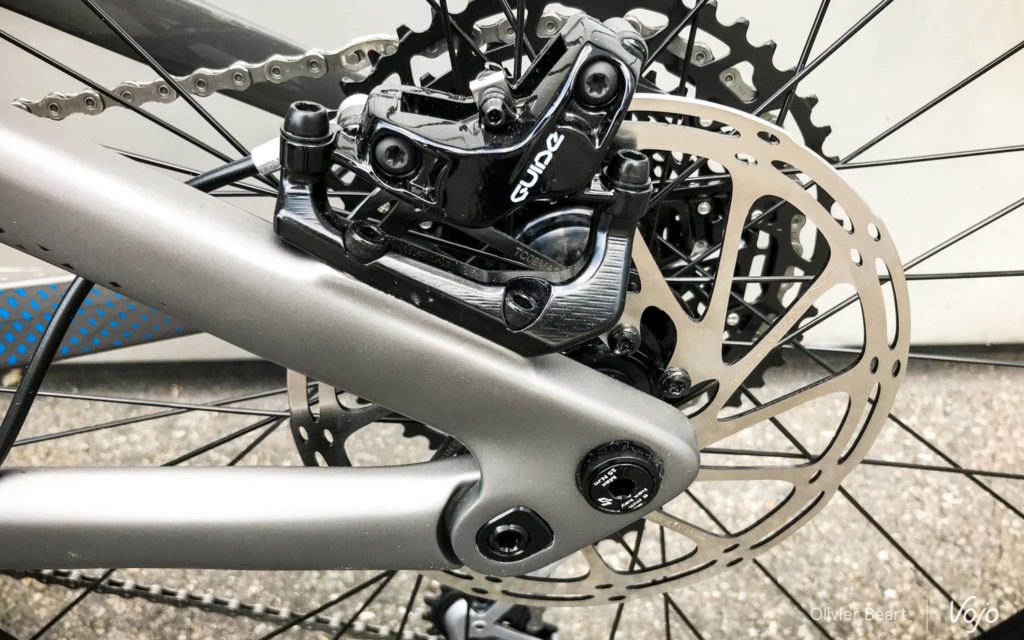 En attendant, on peut déjà vous expliquer concrètement comment cette adaptation aux roues 27,5/29 fonctionne : un petit adaptateur au niveau du boîtier de pédalier permet de changer la hauteur du boîtier et un jeu de direction réversible, type « angle set » permet d’adapter l’angle de direction. La course de l’amortisseur est aussi adaptée. Tout cela est fait en usine, mais un changement a posteriori est aussi envisageable.