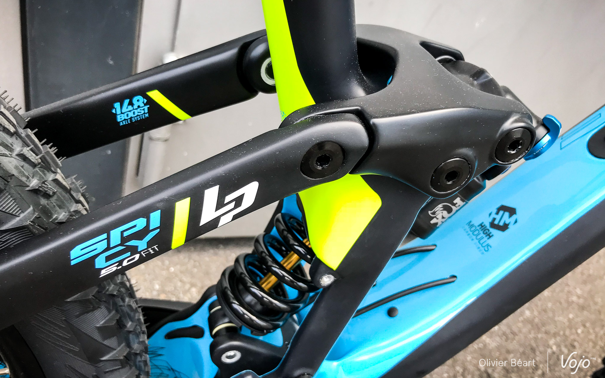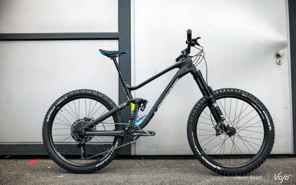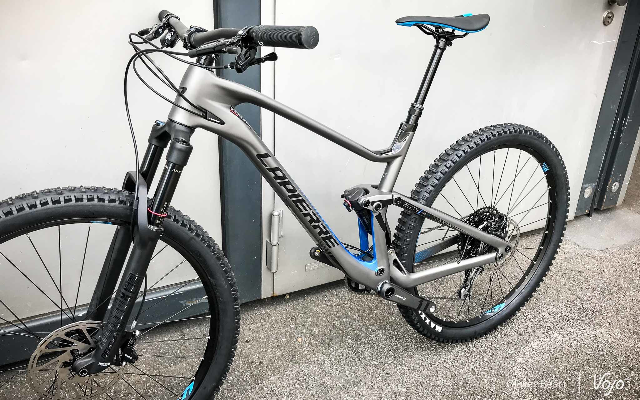 Le Lapierre Spicy est clairement plus fait pour un usage enduro et sera utilisé par Adrien Dailly à son retour à la compétition. Il a un débattement de 160mm en 29 et 170 en 27,5. Il sera prévu pour recevoir des amortisseurs à ressort, comme le DHX2 présent sur ce modèle.