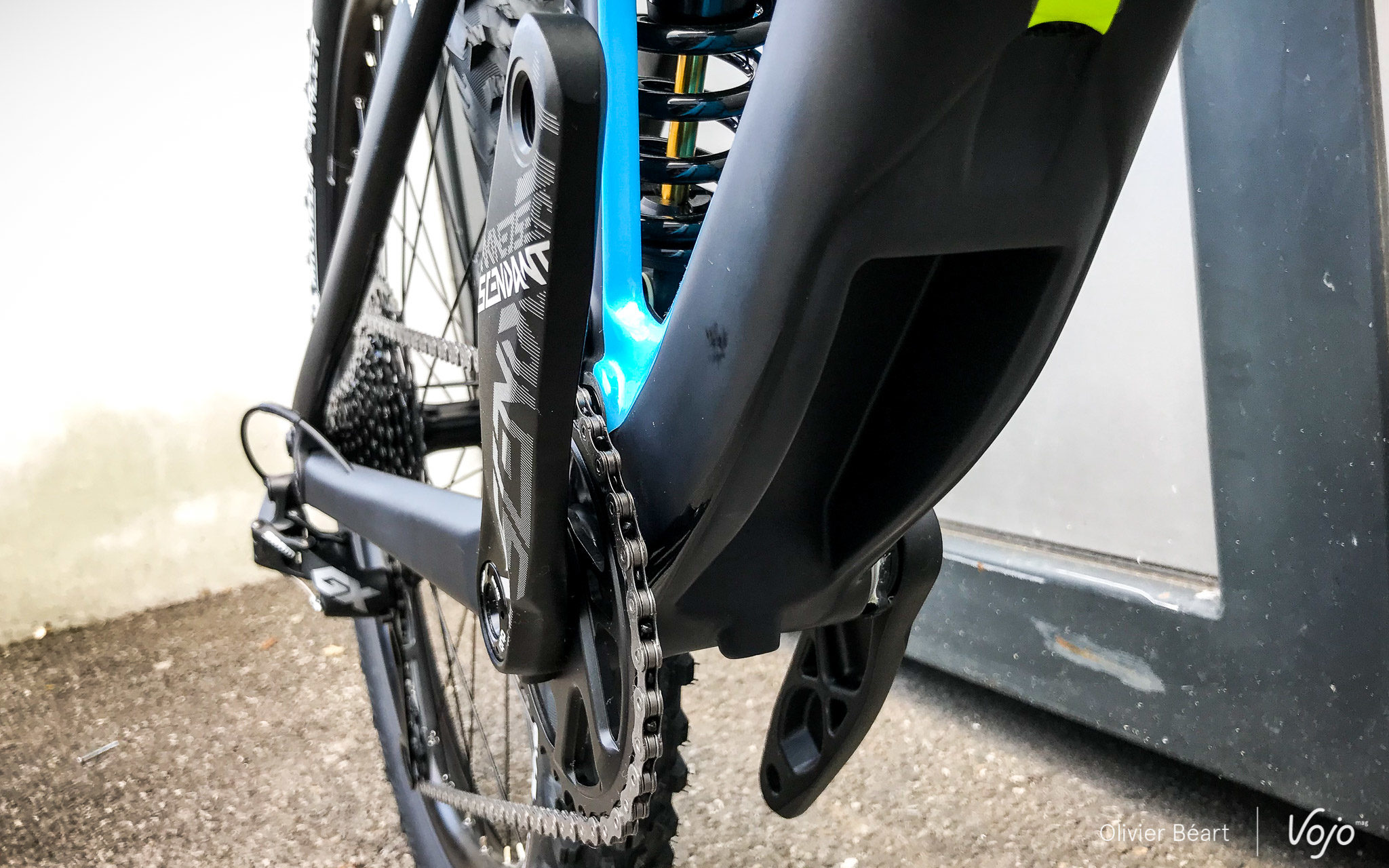 Sous le boîtier de pédalier, on note la présence d’une échancrure, qui reçoit un capot semi-rigide pour former une petite boîte dans laquelle on peut stocker un nécessaire de réparation.