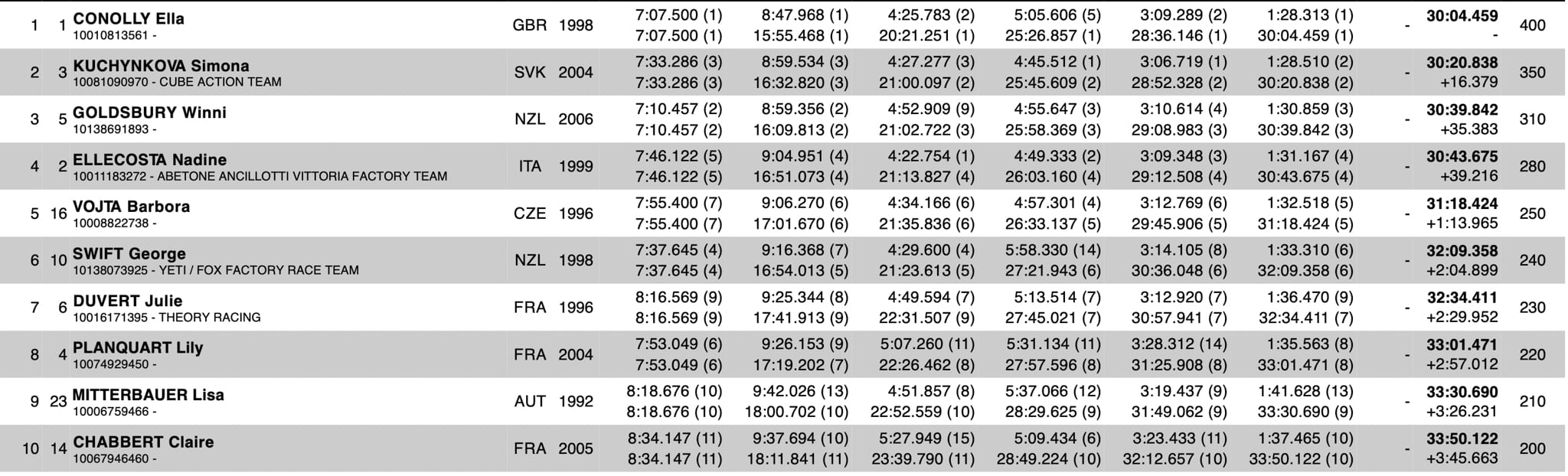 Ella Conolly ne se laisse pas faire et reprend sa place, et la victoire finale à l’issue de la dernière spéciale devant Simona Kuchyňková et Winni Goldsbury. La vainqueur s’étonnait d’ailleurs de sa propre place après avoir beaucoup chuté tout au long de la journée : « Même quand je glissais ou qu’il se passait quelque chose, j’essayais juste de continuer à avancer, et heureusement j’ai réussi à conserver la victoire, mais c’était serré. La boue était dingue sur les trois dernières spéciales, de grosses racines sont apparues, super glissantes, et elles te prenaient constamment par surprise. »