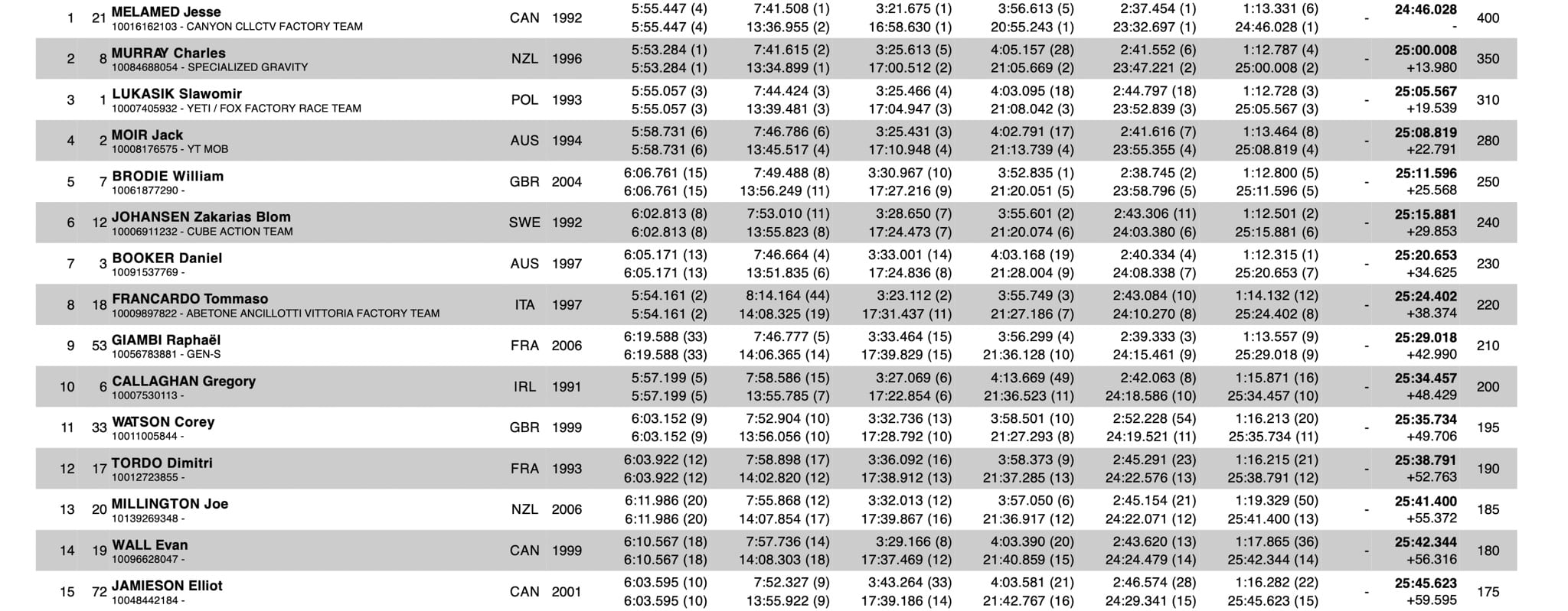 Jesse Melamed remporte cette course avec 13 secondes d’avance, 3 victoires de spéciales et retrouve la plus haute marche du podium, entouré de Charles Murray et Slawomir Lukasik. Il déclarera : « Tout s’est déroulé sans accroc, j’ai fait une seule erreur, une chute lors de la quatrième spéciale, mais à part ça, c’était vraiment propre. Donc j’espérais un bon résultat au général rien que pour ça, alors gagner, c’est incroyable, parce que j’avais juste l’impression de bien rouler. »