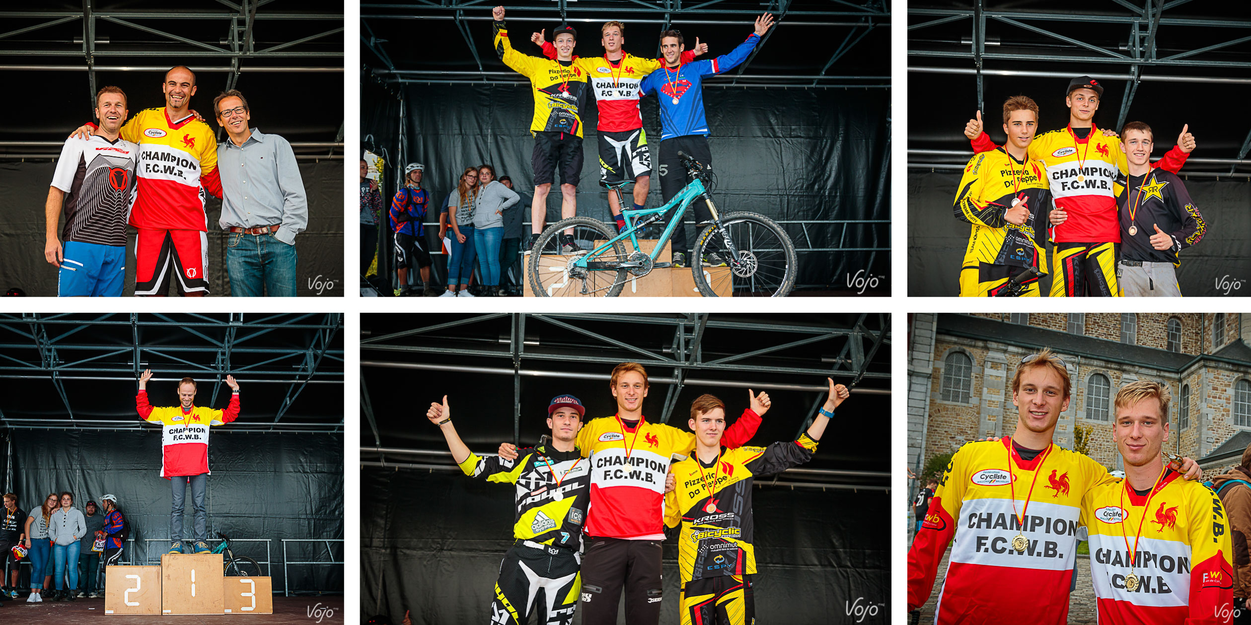 Et les podiums du championnat de Belgique avec, de haut en bas et de gauche à droite, les Masters 2, Elite, Débutants, Master 1, Junior et les deux frères Maes avec leurs maillots distinctifs. Petit jeu pour les Belges : un intrus s’est glissé sur un des podiums, saurez-vous le repérer ?