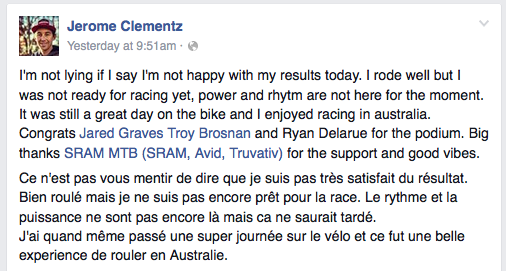 A peine plus loin dans le classement, on remarque aussi la présence de Paul Van Der Ploeg, coureur de XCE Eliminator et ancien champion du Monde de la spécialité qui prend la 7e place. Quant à Jerôme Clementz, il termine 9e. Ce qui ne l’enchante guère, mais ce qui est compréhensible dans la mesure où il est encore en pleine phase de préparation comme il l’explique sur sa page Facebook :