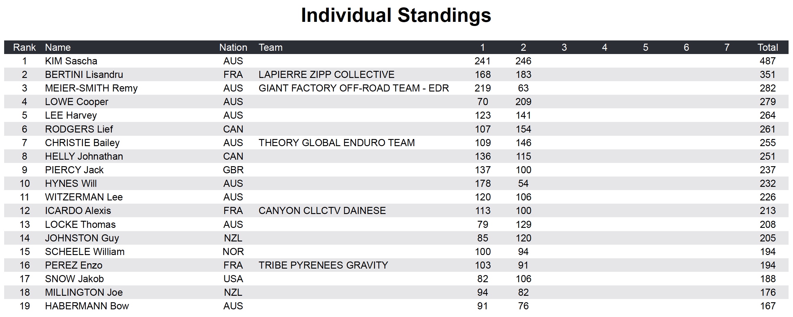Respectivement 2e et 1er à Maydena mais un peu en retrait une semaine plus tard à Derby, Dan Booker et Luke Meier-Smith complètent pour l’instant le podium provisoire. Les deux Australiens ne sont séparés que de 19 points. Le Polonais Slawomir Lukasik est quand à lui un rien plus loin, à la 4e place, et compte 141 unités de retard sur son coéquipier Richie Rude.