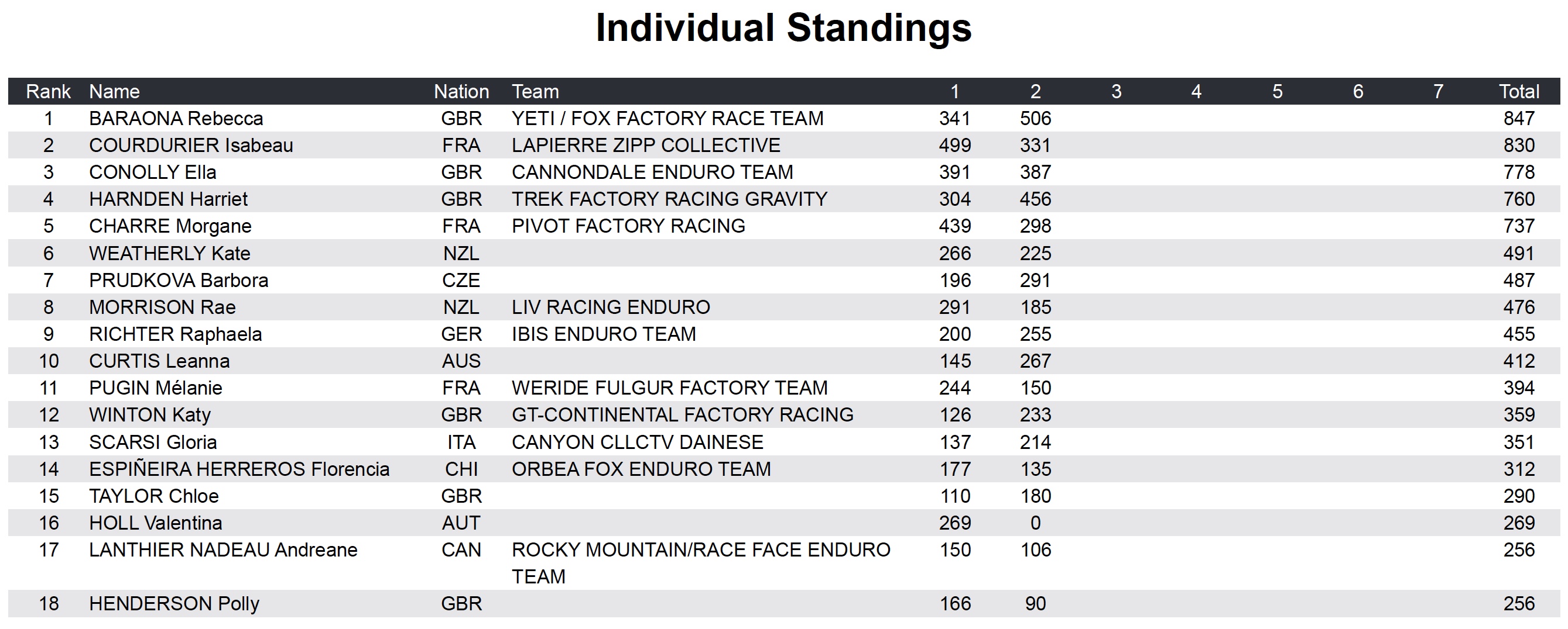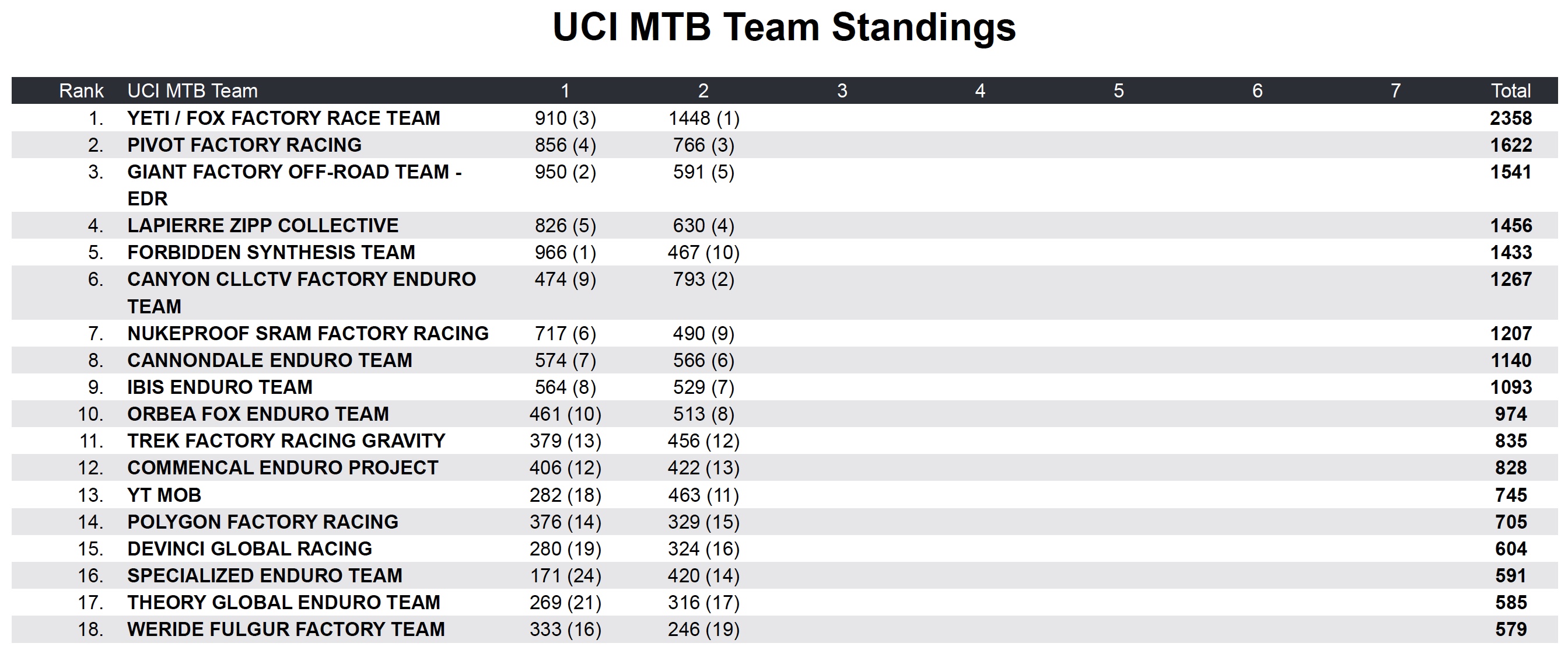 Le classement par équipe est sans surprise largement dominé par le Yeti / Fox Factory Race Team de Richie Rude, Slawomir Lukasik et Bex Baraona, devant le team Pivot Factory Racing de Morgane Charre, Matt Walker et Ed Masters et le Giant Factory Team de Youn Deniaud, Luke Meier-Smith et Mckay Vezina.