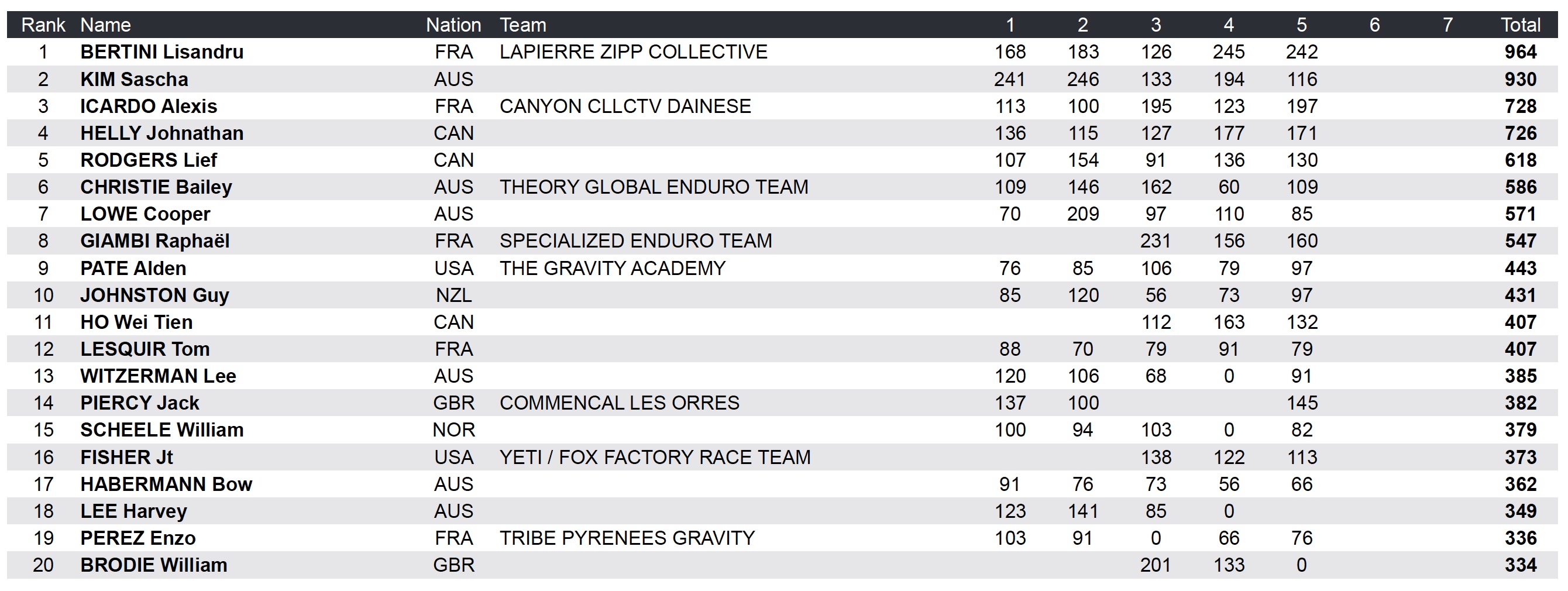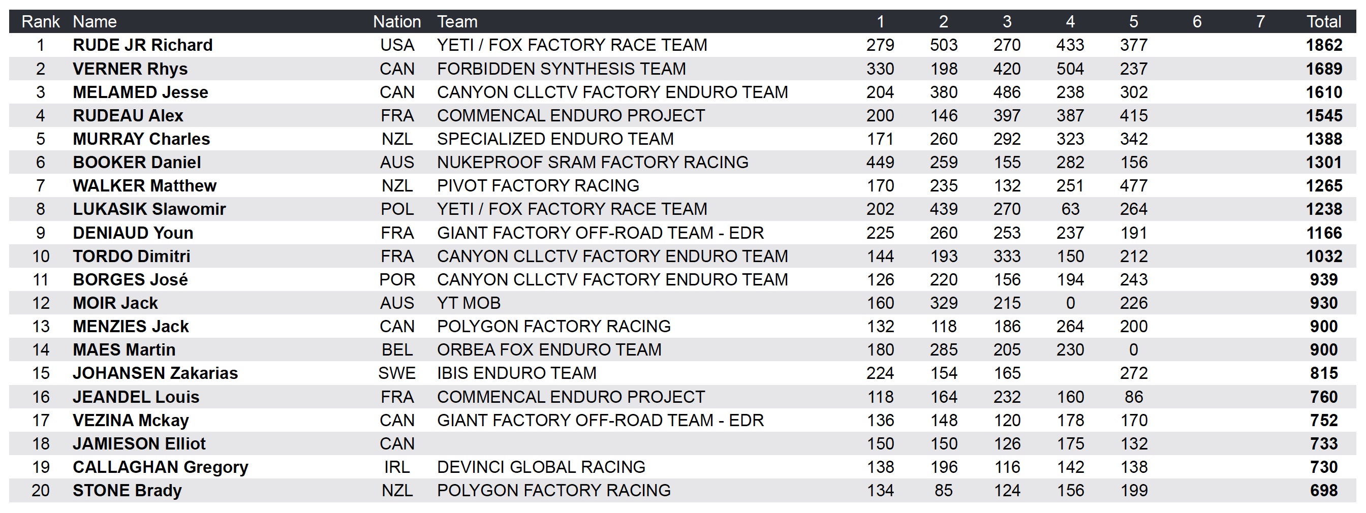 Du côté du classement par équipe, c’est le team Yeti / Fox qui domine pour l’instant, et assez largement même puisqu’il compte plus de 850 points d’avance. Un avantage notamment forgé lors de la double victoire à Derby (Bex Baraona chez les femmes et Richie Rude chez les hommes) qui avait été complétée par la 2e place de Slawomir Lukasik.