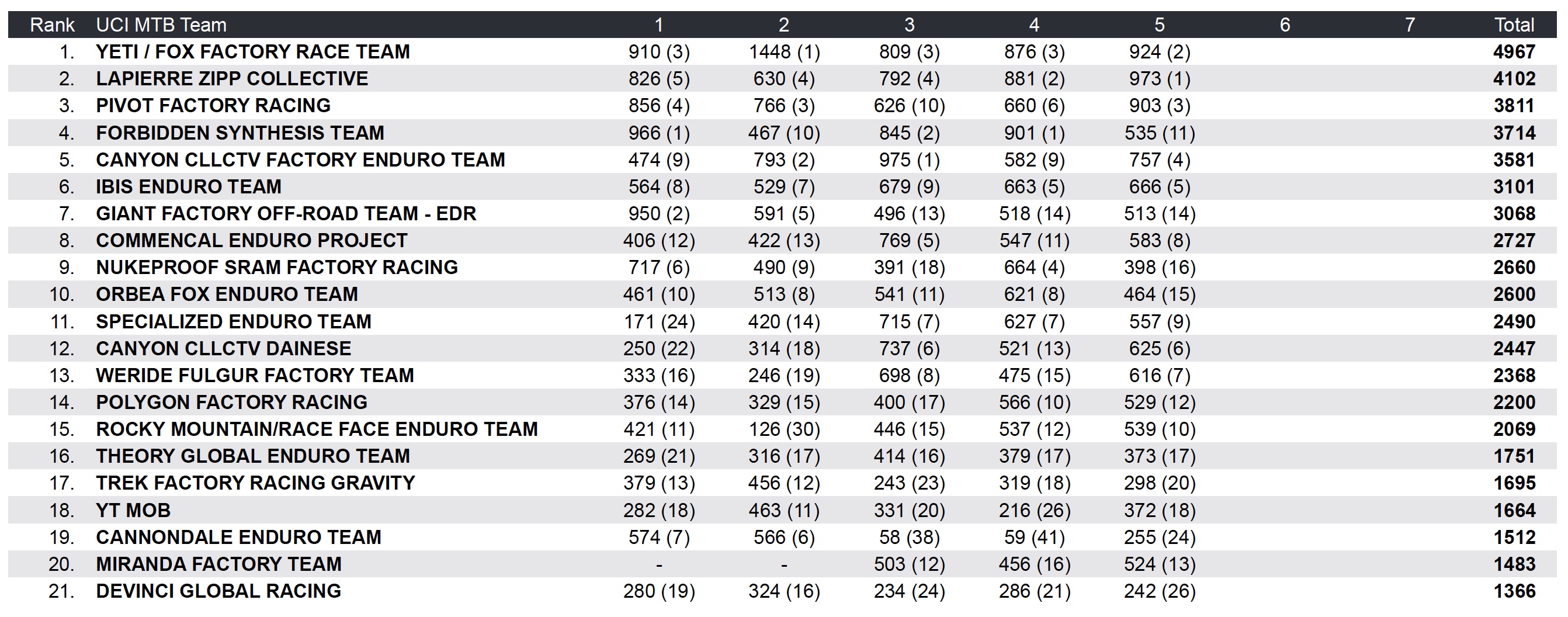 Le Lapierre Zipp Collective d’Isabeau Courdurier et Adrien Dailly occupe la 2e place alors que le team Pivot Factory Racing de Morgane Charre et Matt Walker est 3e à un peu moins de 300 points de la 2e place.