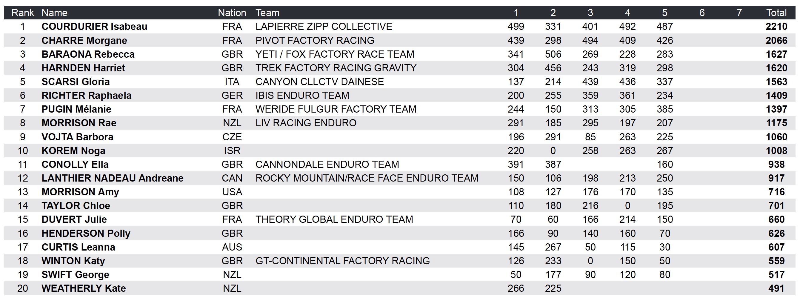 Le top 10 après ces cinq premières manches de la saison est complété par Rae Morrison (8e), Barbora Vojta (9e) et Noga Korem (10e). Plus loin, on retrouve notamment Ella Conolly (11e, absente sur les 3e et 4e manches), Andréane Lanthier-Nadeau (12e), Julie Duvert (15e) et Katy Winton (18e).