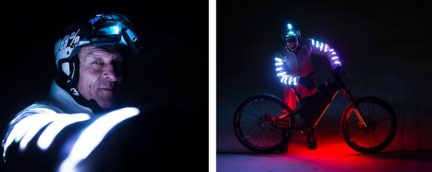 Conçue par Maëlys Rébuttini, une jeune artiste marseillaise, cette combinaison lumineuse n’offrait à Eric Barone qu’une vision claire à 3 ou 4 mètres devant lui. Elle a en revanche offert à Marc Rébuttini (photographe et réalisateur) et à Guillaume Stagnaro (artiste plasticien, enseignant et chercheur) des images formidables.