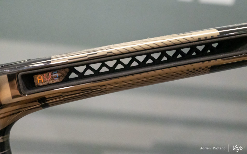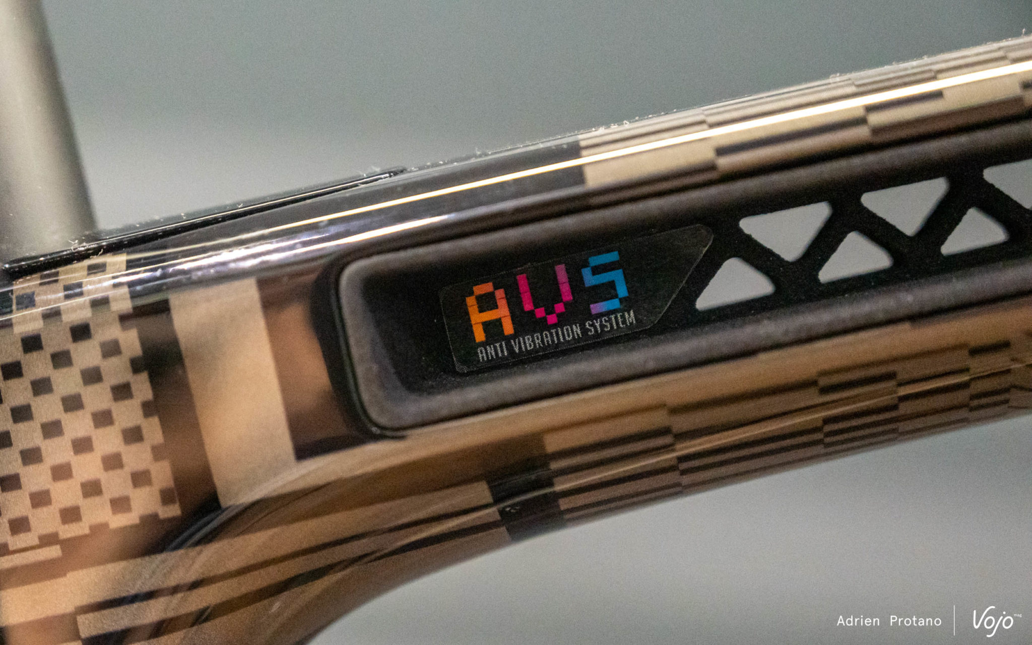 Aucune de ces hypothèses ! Il s’agit là du système AVS, pour « Anti vibration system« , directement inspiré de celui qu’on retrouvait sur une évolution de l’Endorphin originel, présentée en 1998. Sur ce modèle, ce système prenait la forme d’une plaque positionnée sur l’arrière du tube supérieur, là où le tissage des fibres concentre toutes les vibrations. Pour cette nouvelle version, Scott a travaillé sur un dispositif similaire dans son inspiration, mais sous une autre forme matérielle, à savoir ce tissage triangulaire. Nous ne disposons pas de détails techniques supplémentaires à ce stade-ci, la marque suisse préférant rester discrète quant à ceux-ci pour le moment.