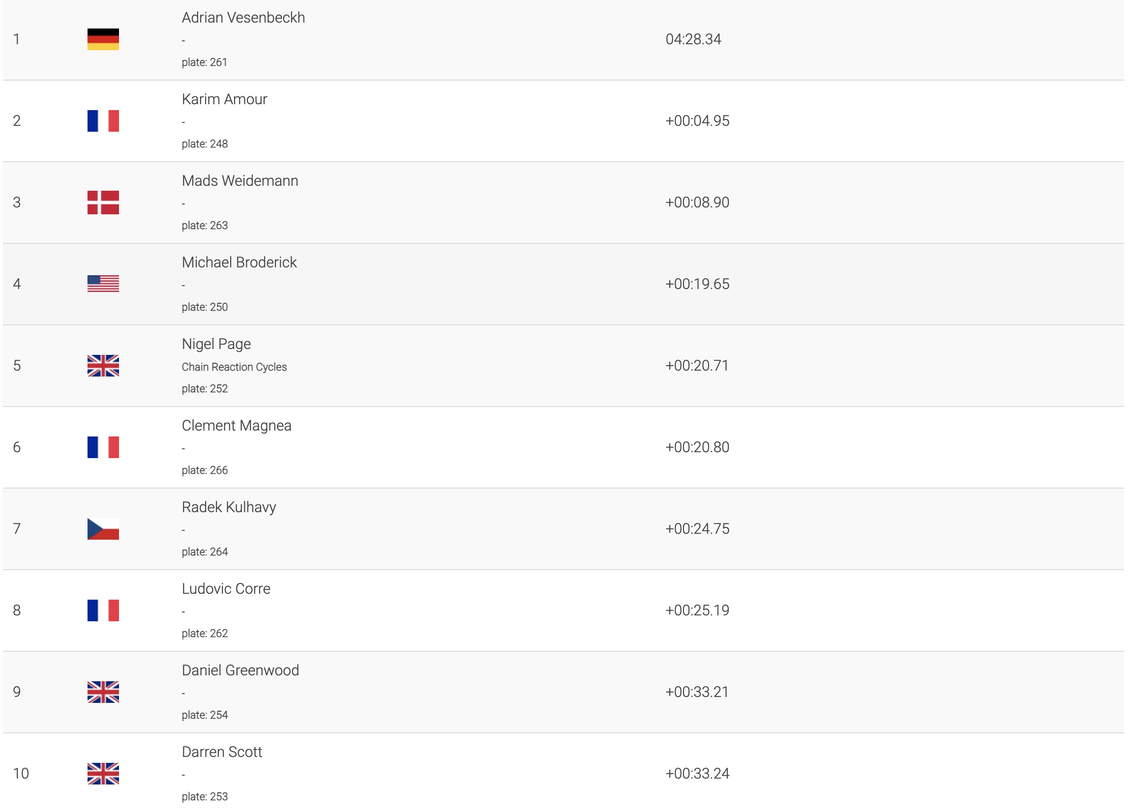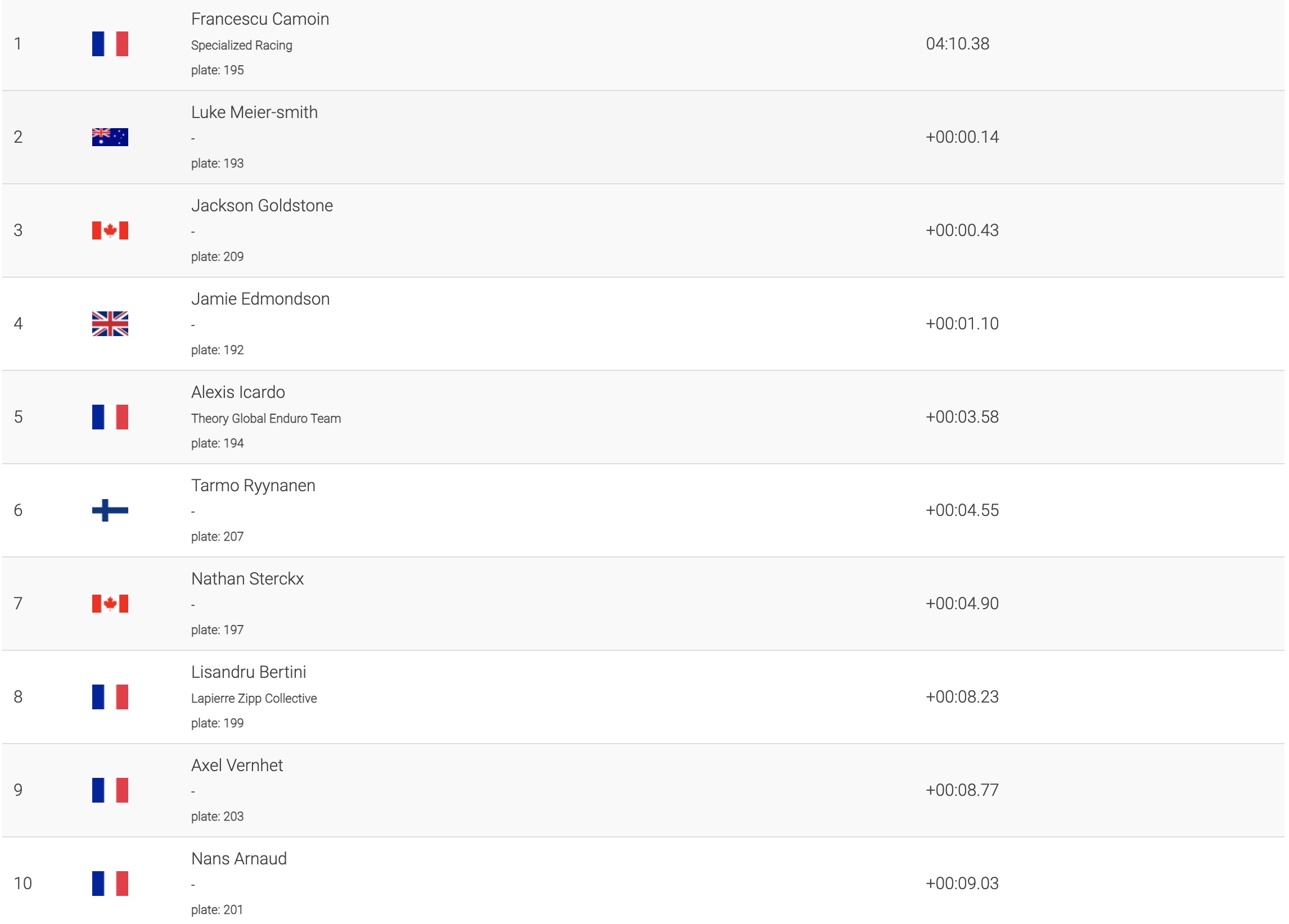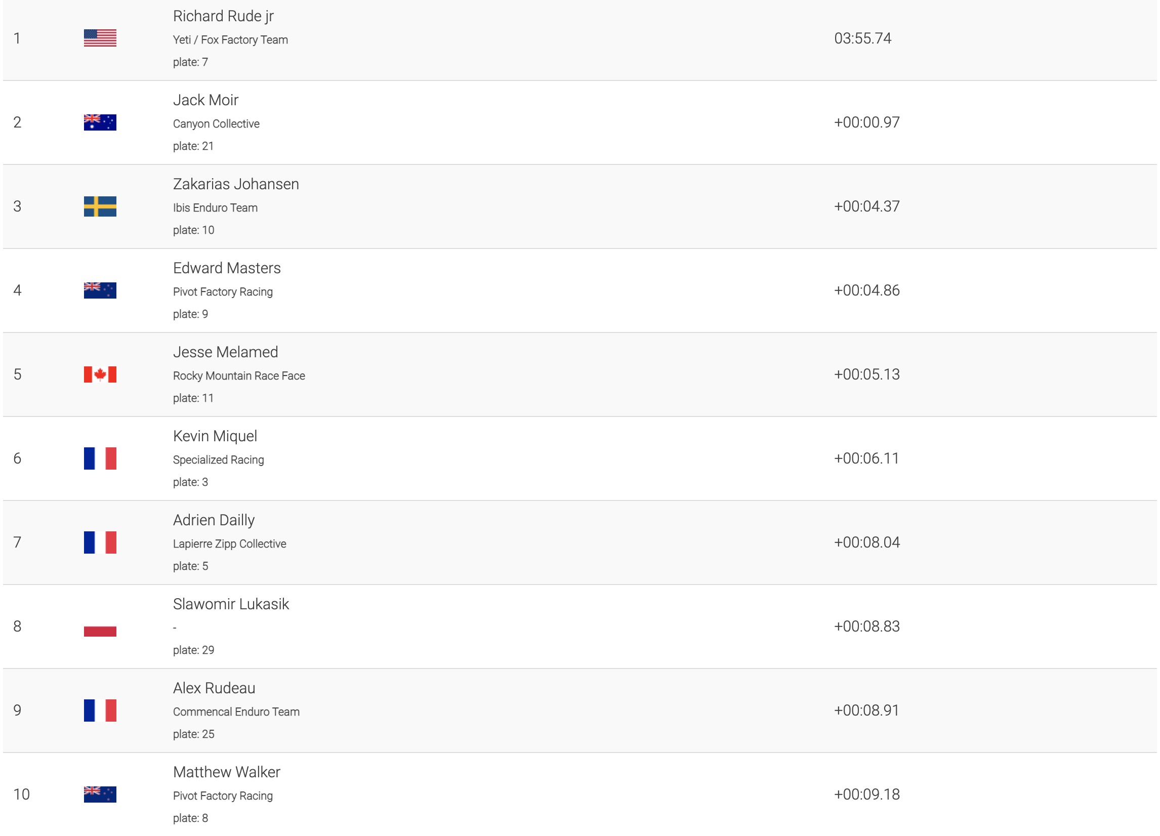 Le top 5 est complété par Ed Masters et Jesse Melamed qui perdent 5 secondes sur Rude. Derrière, on retrouve deux Français : Kevin Miquel (6e) et Adrien Dailly, (7e) suivis de Slawomir Lukasik (8e), d’un autre Français en la personne d’Alex Rudeau (9e), et de Matt Walker qui complète le top 10.