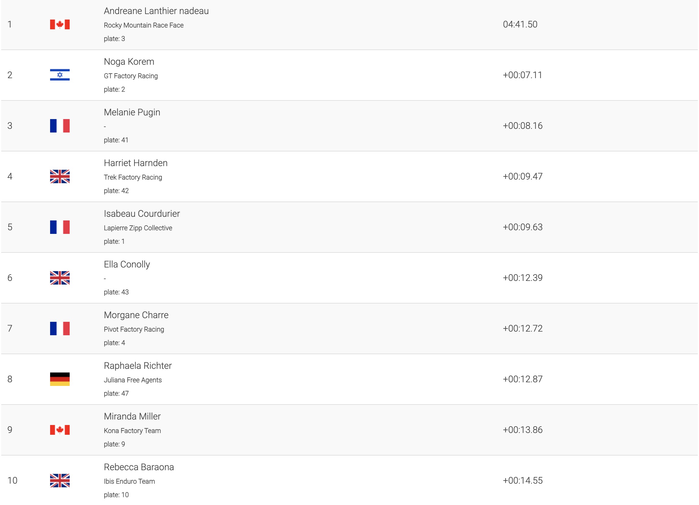 Pour l’instant, c’est Noga Korem qui pointe à la 2e place du classement provisoire, devant Mélanie Pugin à 8 secondes d’ALN. Harriet Harnden et Isabeau Courdurier, victime d’une crevaison, complètent le top 5 de cette spéciale avec 9 bonnes secondes de retard sur la 1ère place.
