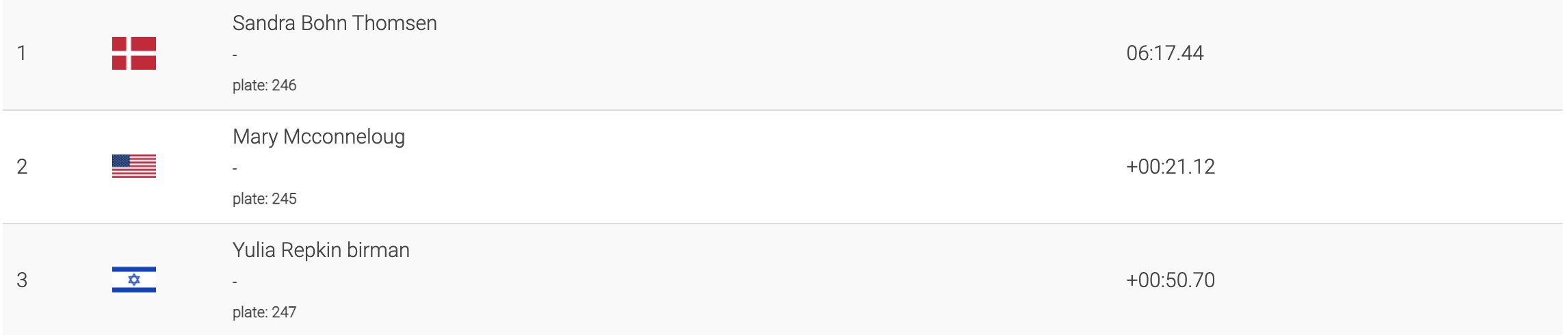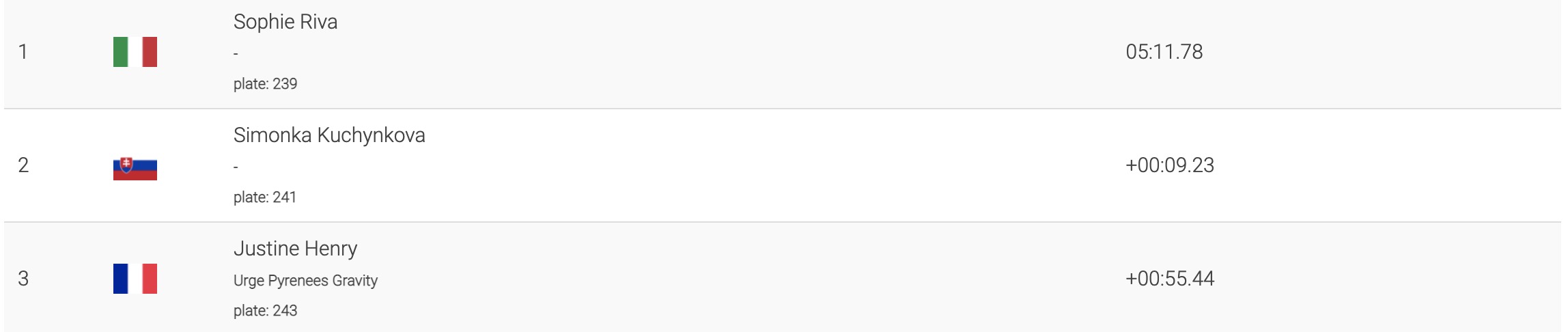 Du côté des femmes Master 35+ enfin, on n’assistera pas à une 4e victoire en autant de manches pour Leonie Picton. L’Australienne avait lourdement chuté lors des entraînements puis en course il y a deux jours à La Thuile, ce qui ne l’avait pas empêché de remporter la course. Mais elle a décidé de ne pas s’aligner au départ ce week-end suite à ce qui semblerait bien être une commotion. En son absence, c’est la Danoise Sandra Bohn Thomsen qui prend la tête de la course au terme de cette Pro Stage, avec une avance déjà confortable de 21 secondes sur l’Américaine Mary Mcconneloug et 50 secondes sur l’Israëlienne Yulia Repkin birman.
